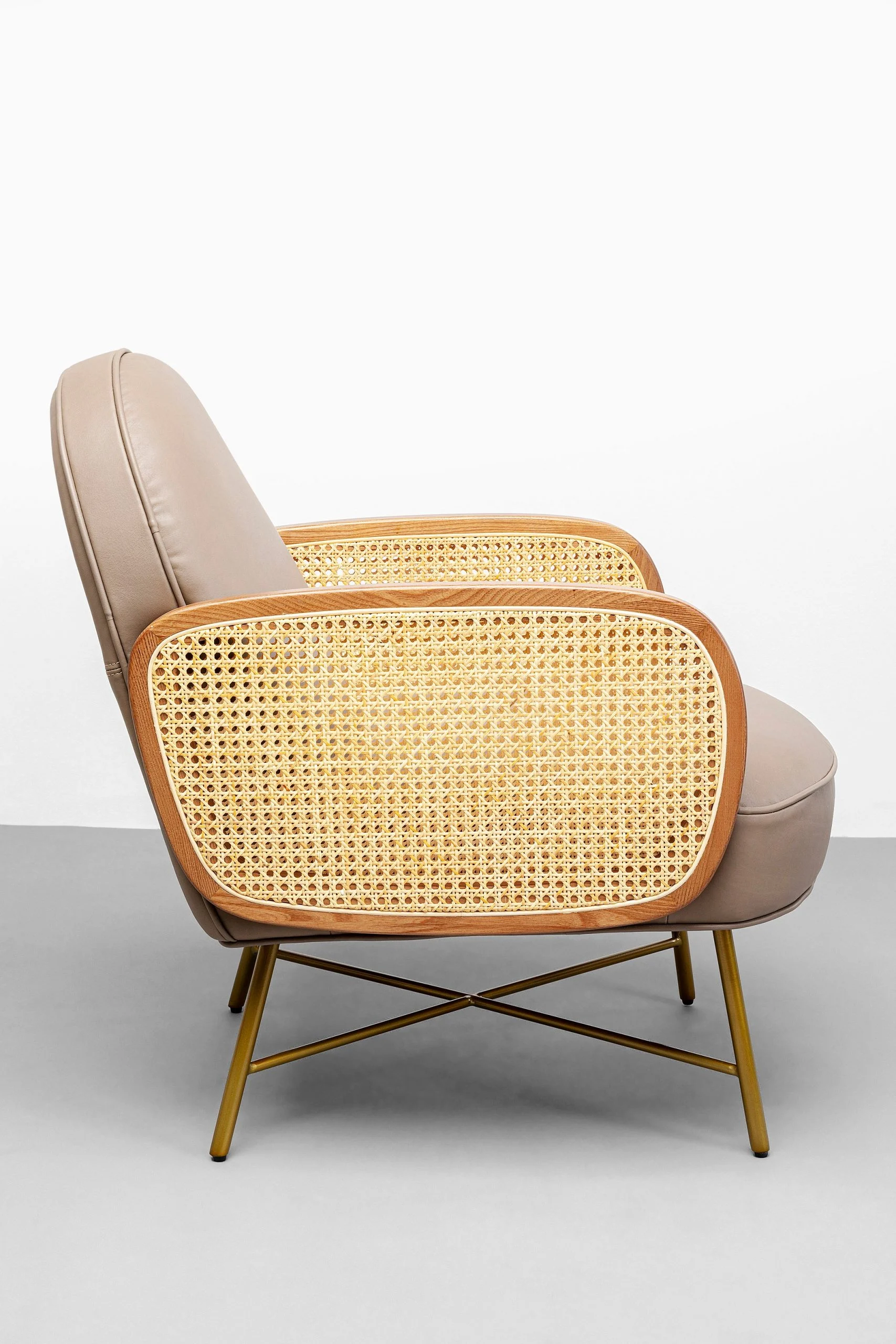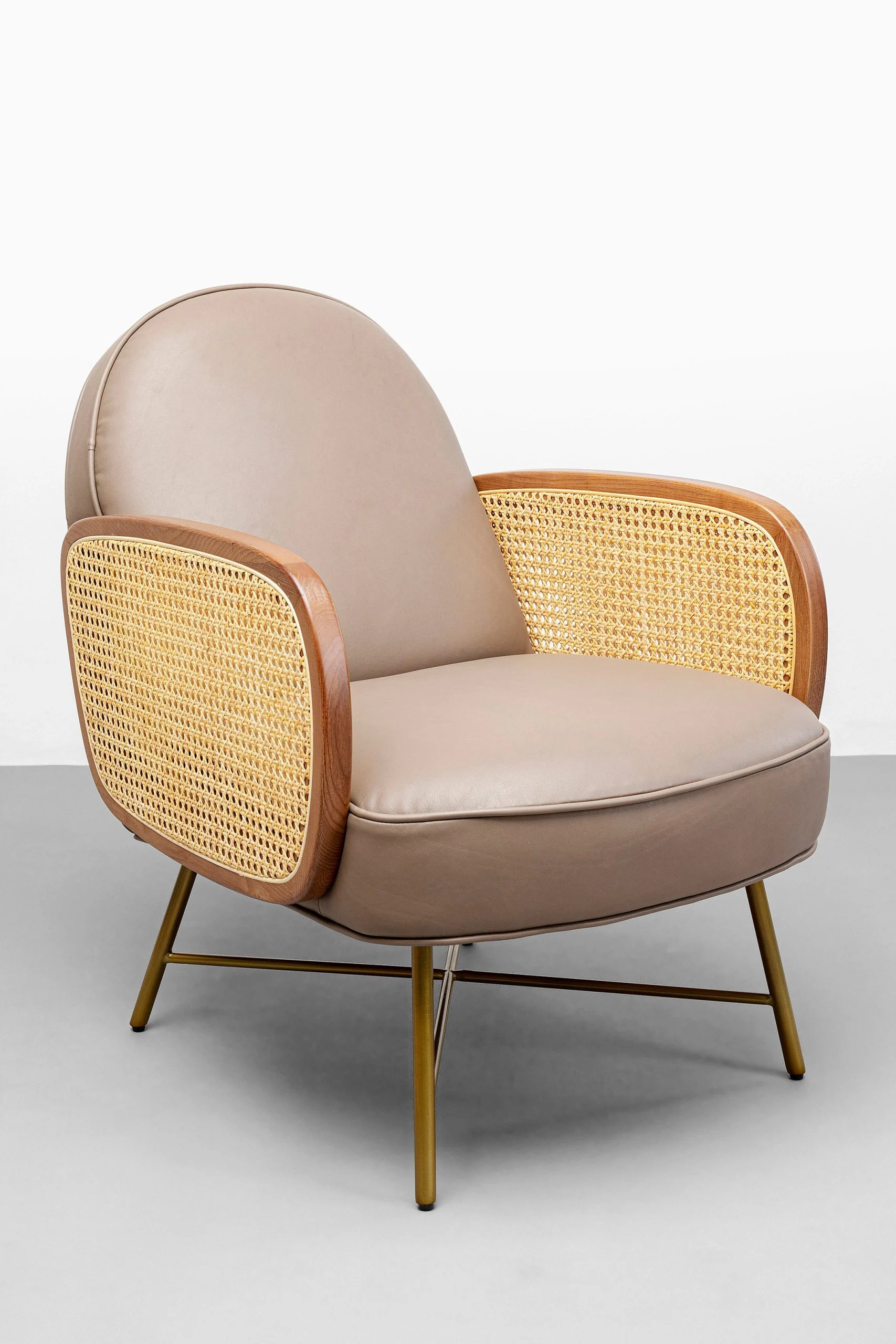 Description: The Bahia armchair is a real eye-catcher and a highlight in any living room. The luxurious real leather cover in grey gives the armchair a classy look, while the sturdy steel legs in a chic lacquer finish ensure stability and durability. The rattan armrests also add a design highlight. The comfortable foam upholstery with no-sag under-springing provides optimal support for the body and ensures relaxed sitting. The modern and unusual design of the Bahia armchair makes it a real statement piece in your living room or bedroom. The relaxation armchair is supplied already assembled. With a seat height of 43 cm, the Bahia armchair is also ideal for tallish people. You can combine the armchair with other original designer furniture and accessories to create a unique ambience in your home.
