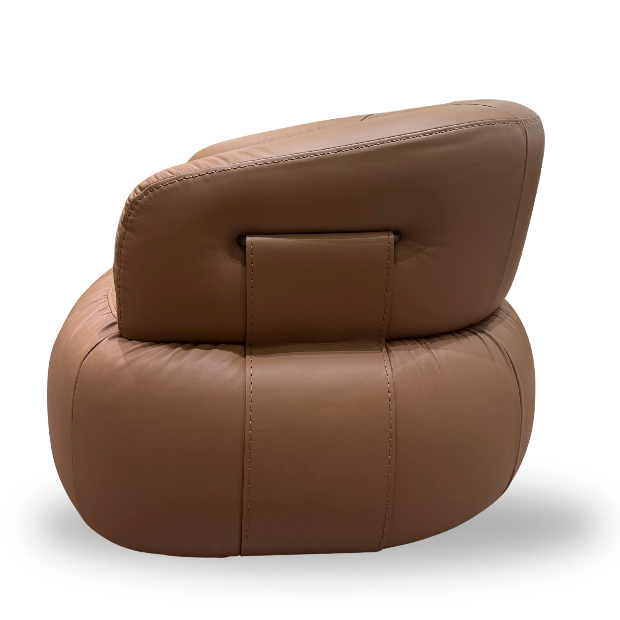 Description: Elegant, modern lounge chair defined by arounded silhouette. It is upholstered inpremium tan leather with soft gathers, offering a statement piece that promises bothcomfort and sophisticated style.