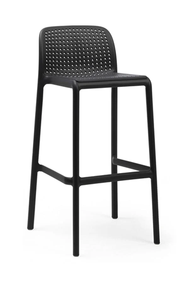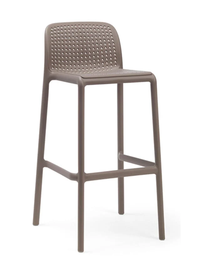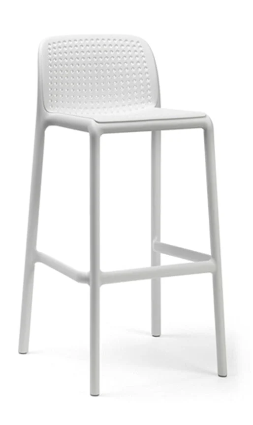 Description: Fiberglass single-body stool for outdoor use, with a perforation pattern across the seat and backrest that complements the soft fabric padding. Lightweight and stackable.