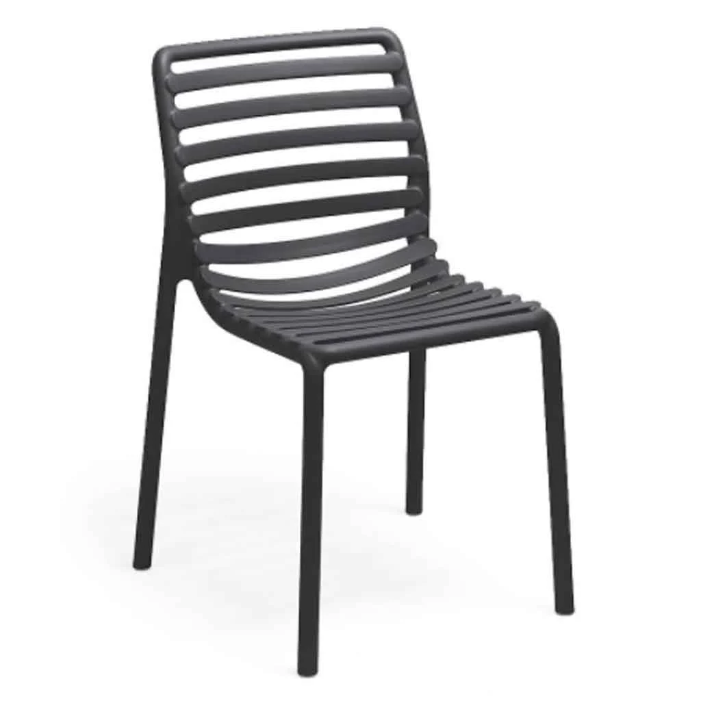 Description: The slatted design is given a contemporary look for Doga Bistrot, an outdoor chair without armrests made of fiberglass resin. It is handy to move, stackable, easily sanitized, and entirely recyclable.