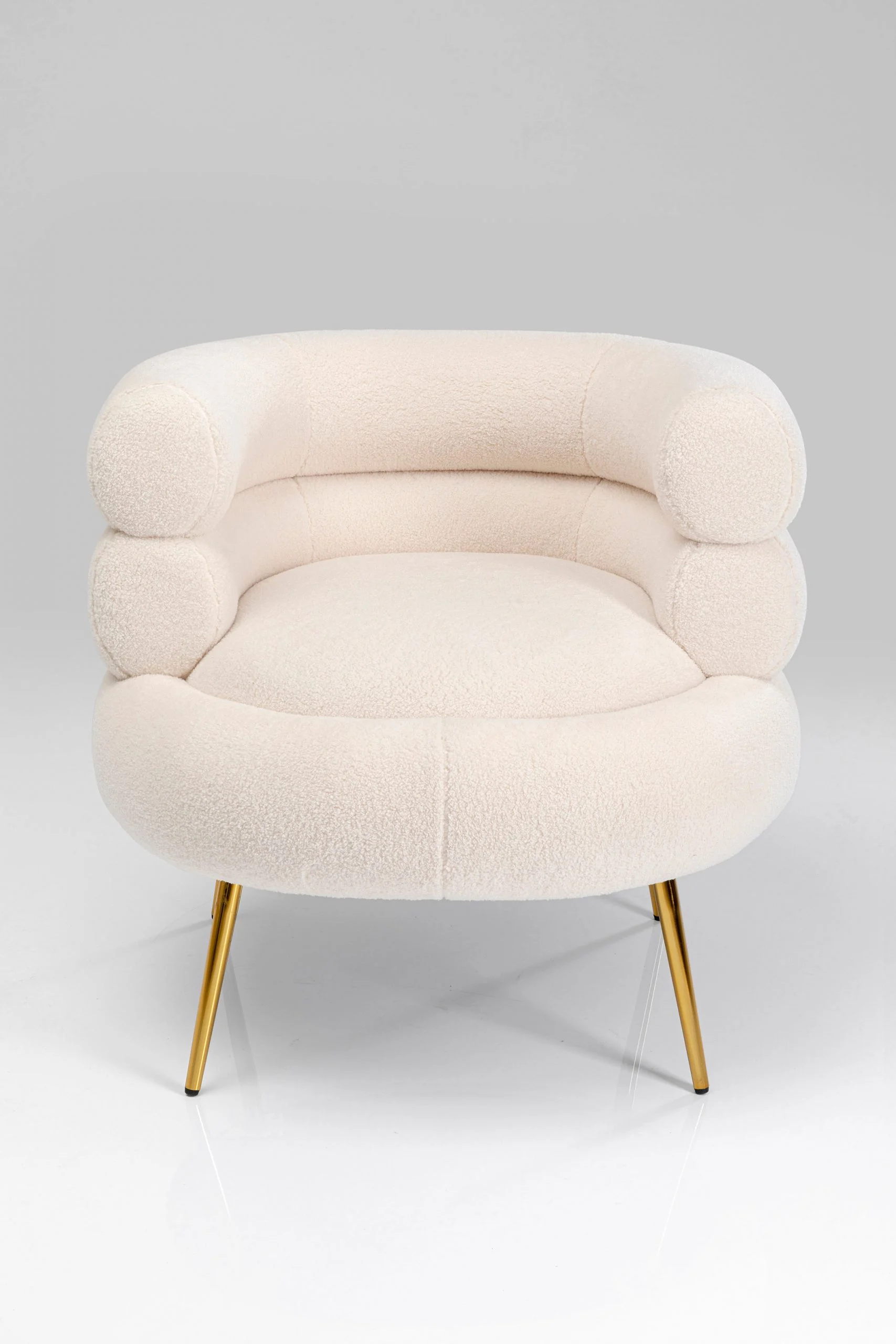 Description: Experience the incomparable comfort of this designer armchair in cream with its fluffy boucl cover. With its exceptional continuous arm and backrest made of rounded elements as well as the foam padding, this lounge armchair offers first-class seating comfort. As a unique piece of furniture, it meets the highest design standards and embodies timeless elegance. Transform your living room or any other room into a stylish place to relax and enjoy life with this elegant, cream-colored solo armchair. The gold-colored legs are stable and made of titanium-coated steel. They give the retro armchair an extra touch of charm. Experience the luxury of a special seat in which to enjoy your most precious moments. The armchair can support up to 150 kg and has a seat height of 48 cm.