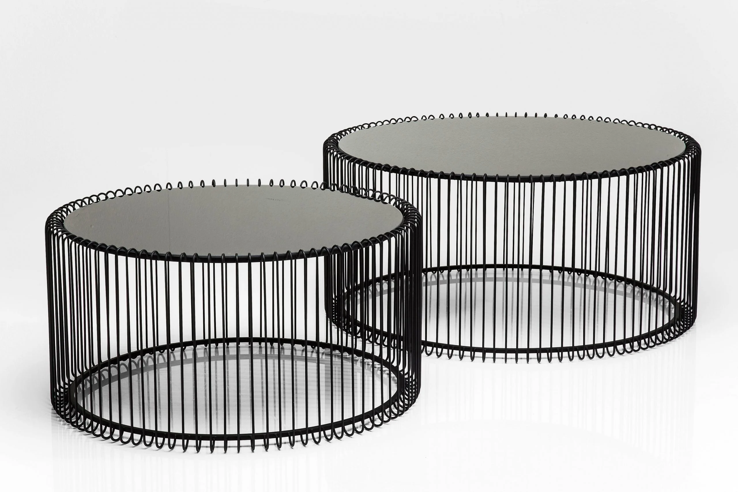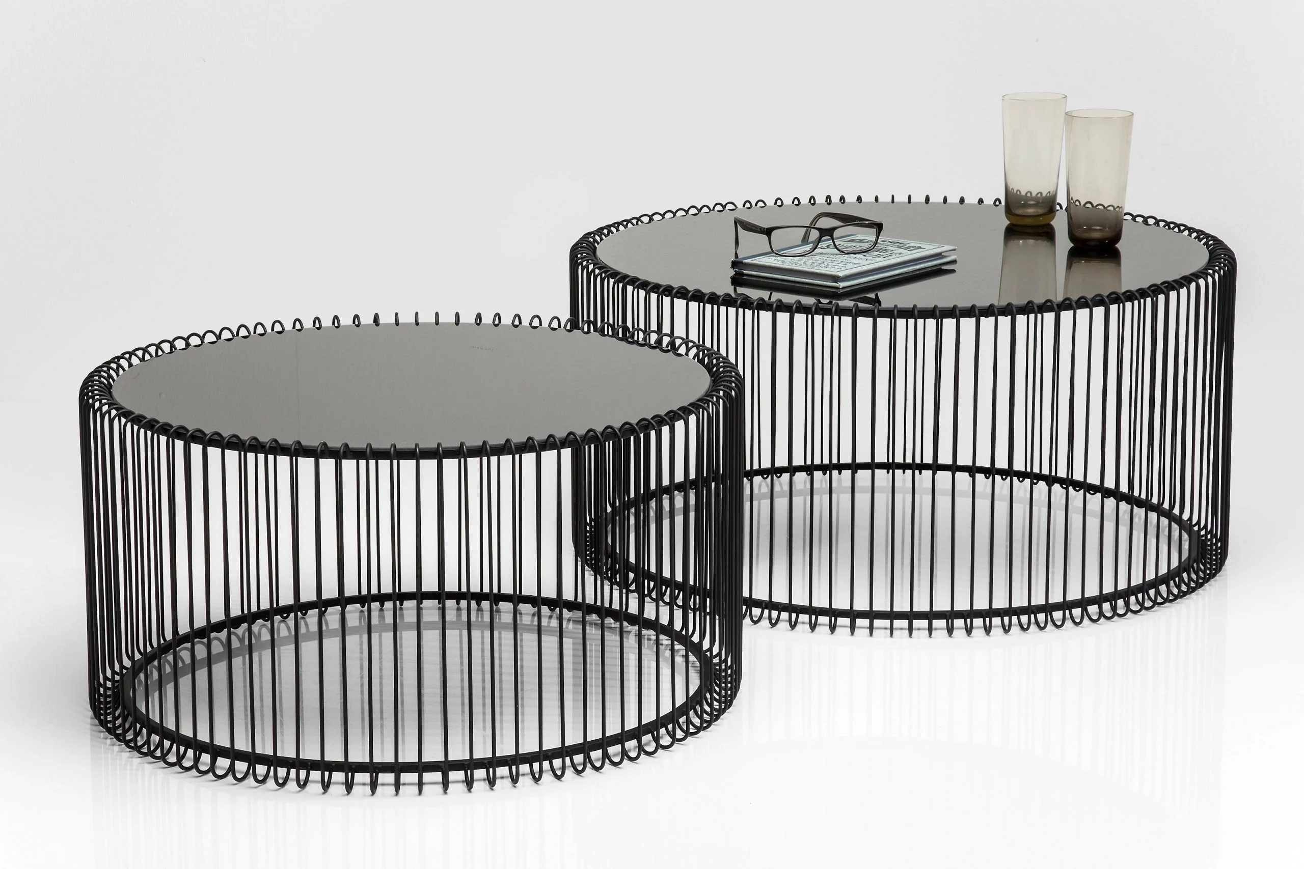 Description: Coffee table with elegant lines. The Wire Black coffee table set looks as if sketched and celebrates the elegance of the minimalist. The black, finely drawn round frame with slender metal rods supports a table top of deep black glass. A modern and cleverly designed composition that looks light-footed and filigree in spite of its striking appearance. Always an enrichment for any modern, reduced furnishing style. The Wire series is available in black, white or copper and two different sizes.