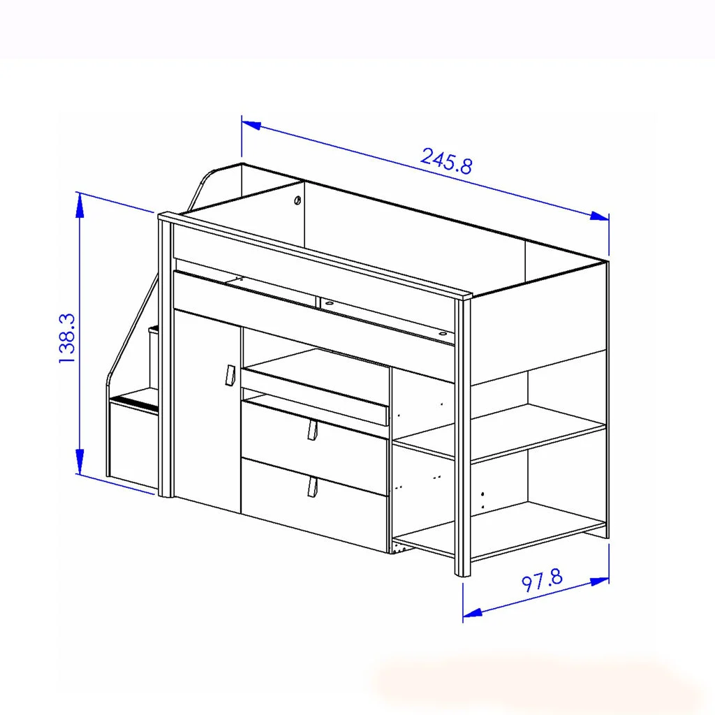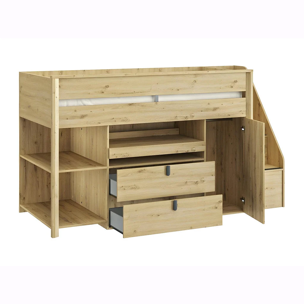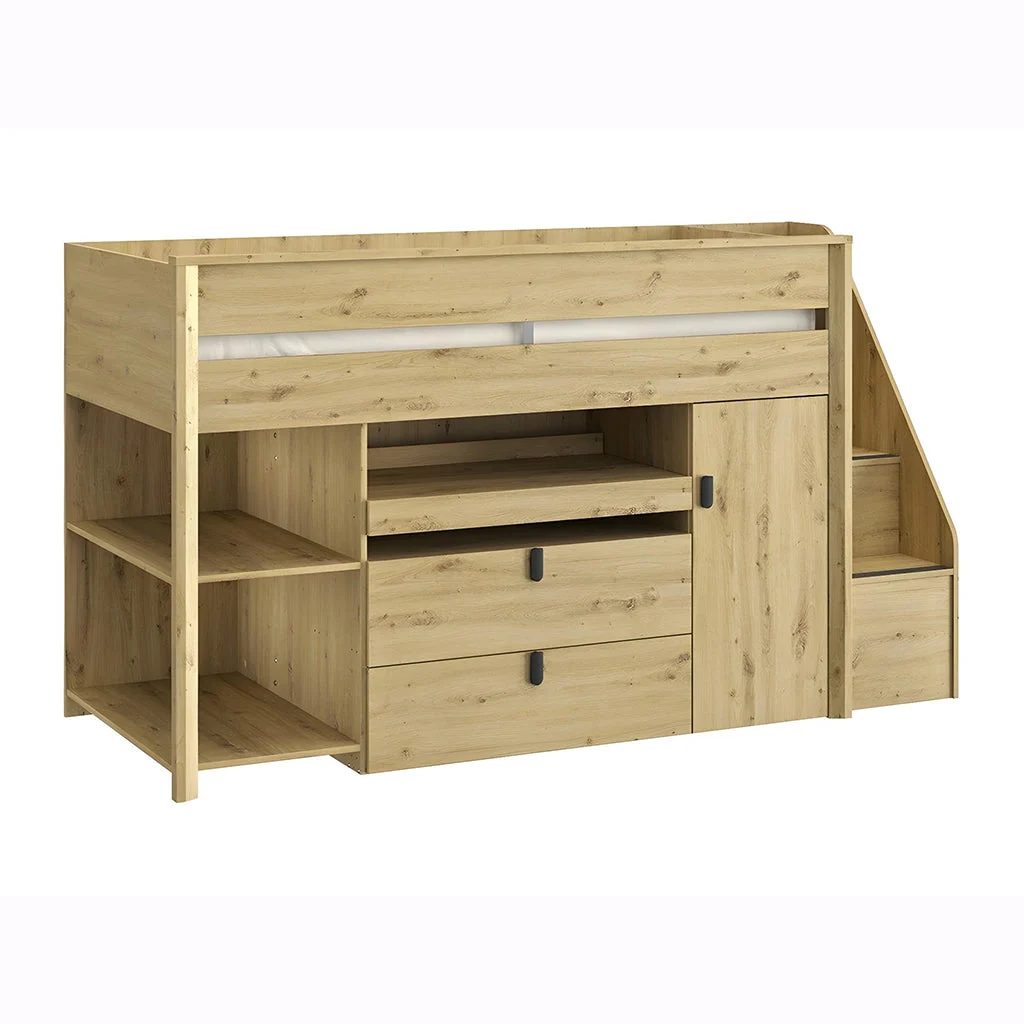 Description: Compact bed color beige, that fit perfectly into child’s bedroom. This bed combines a 90×200 cm bed, a wardrobe, a sliding desk, drawers, side shelves and numerous storage areas.