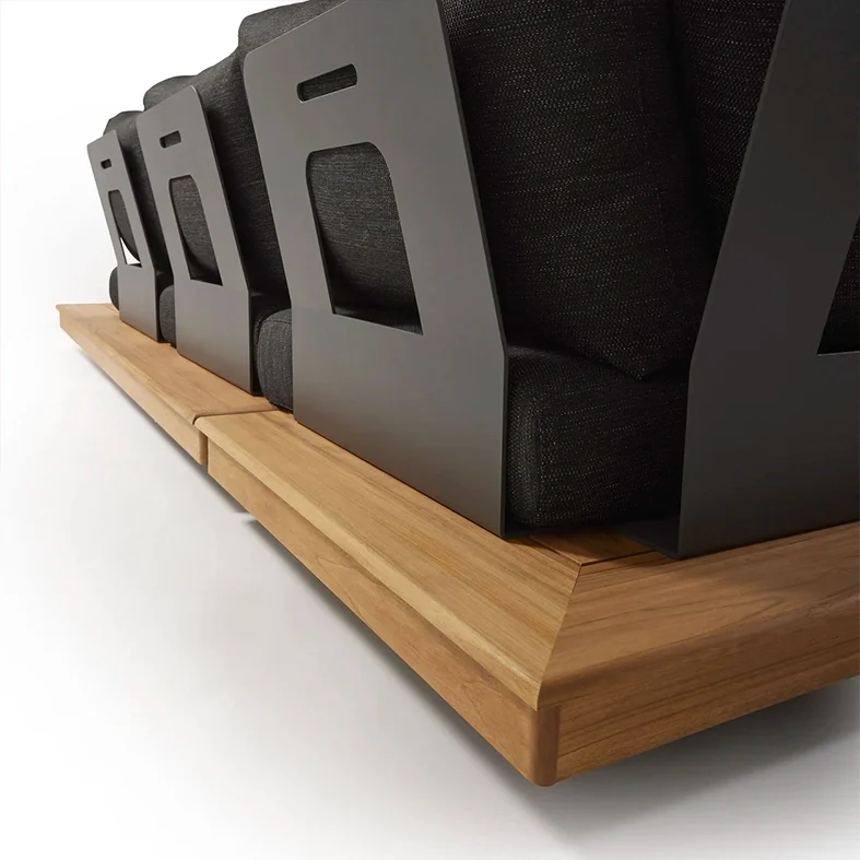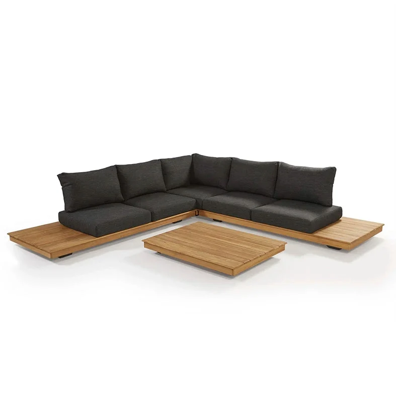 Description: This modern outdoor sectional set combines minimalist design with natural elegance, featuring a low-profile teak wood frame, plush charcoal cushions, and a matching coffee table accented with vibrant dcor perfect for stylish, comfortable lounging in any contemporary garden or terrace setting.