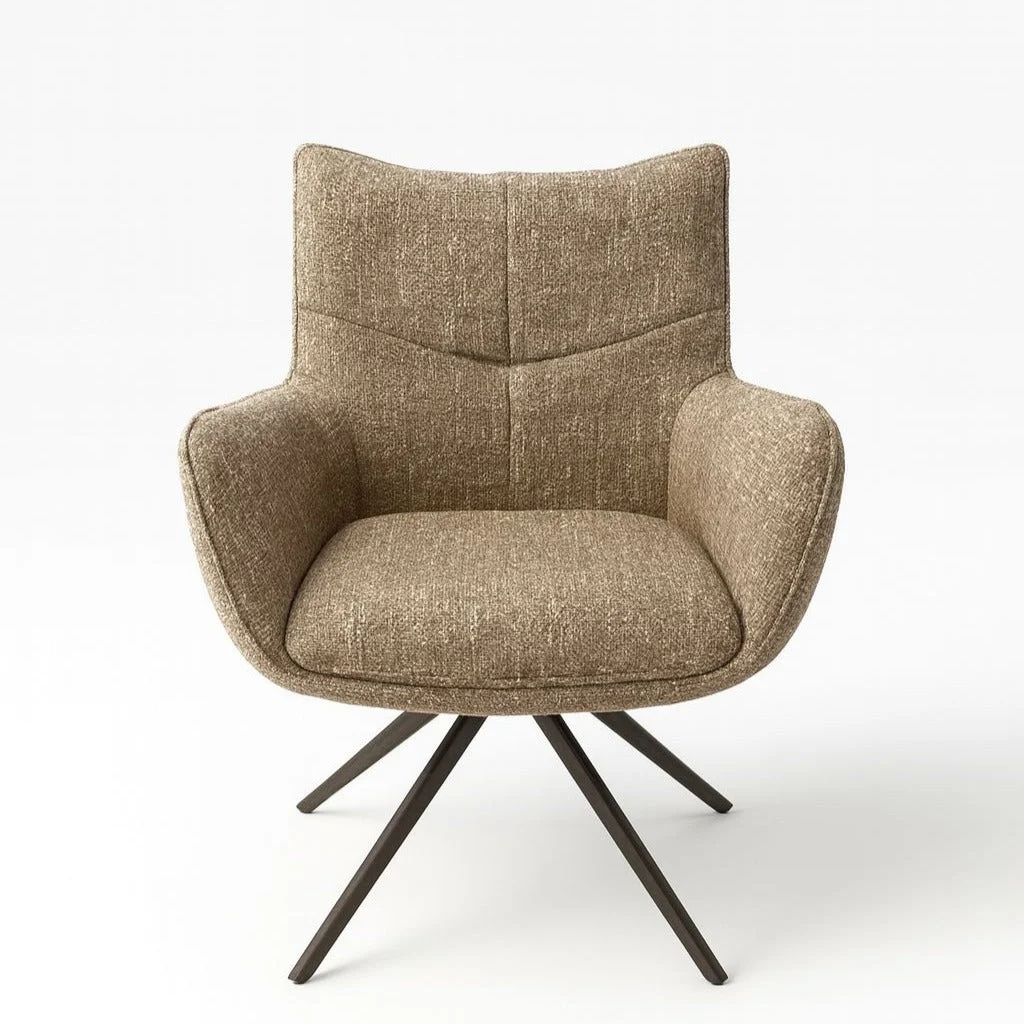Description:Contemporary armchair with a textured brown fabric finish, plush cushioning, and angled armrests, set on sleek black metal legs for a modern yet cozy seating experience.