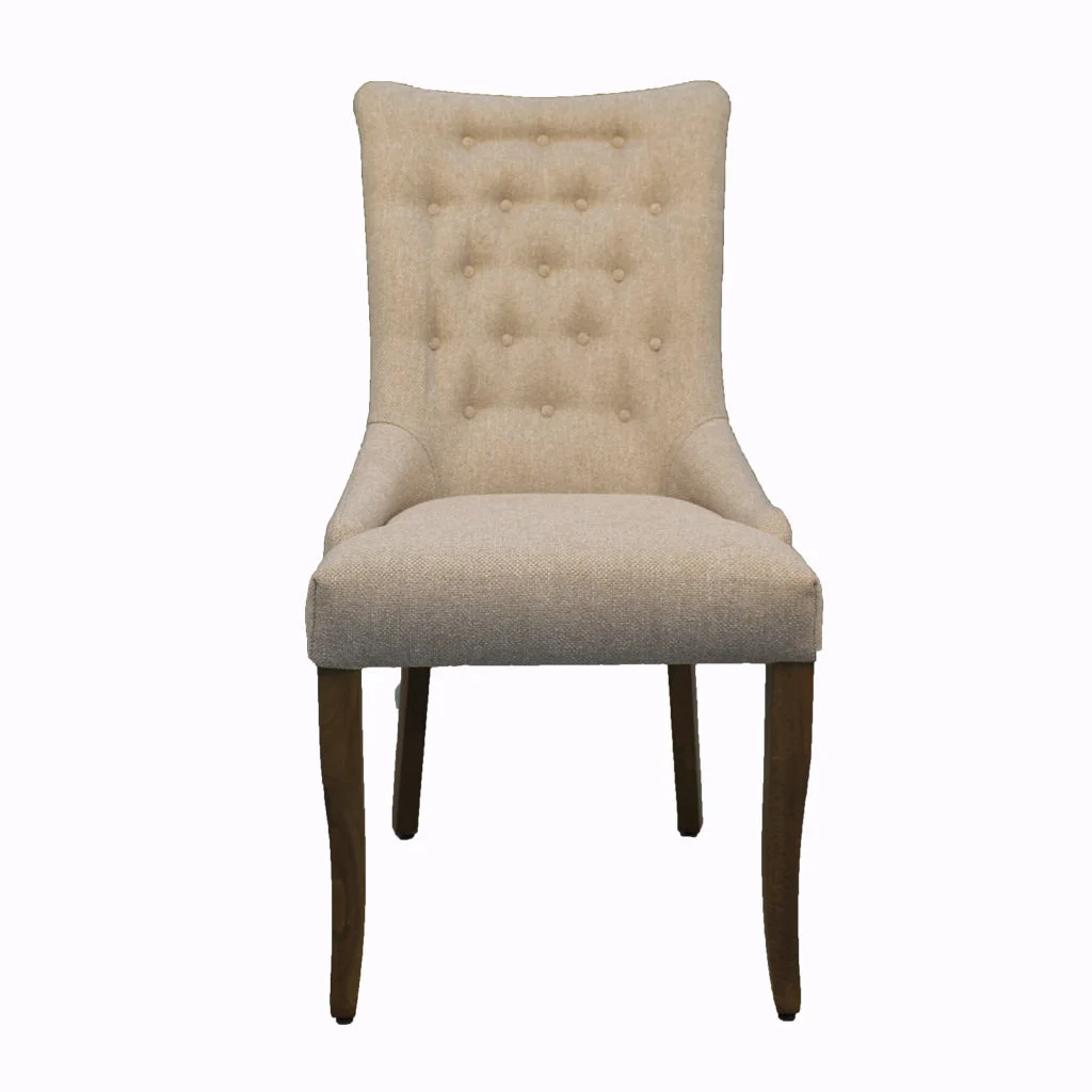 Description: This is an elegant upholstered dining chair with a high, tufted backrest. The chair features a soft, neutral-colored fabric that covers the padded seat and back, providing both comfort and style. The button-tufted detailing on the backrest adds a classic and sophisticated touch.