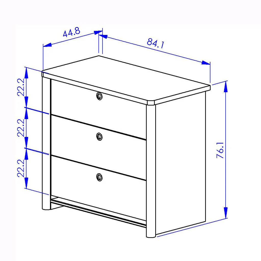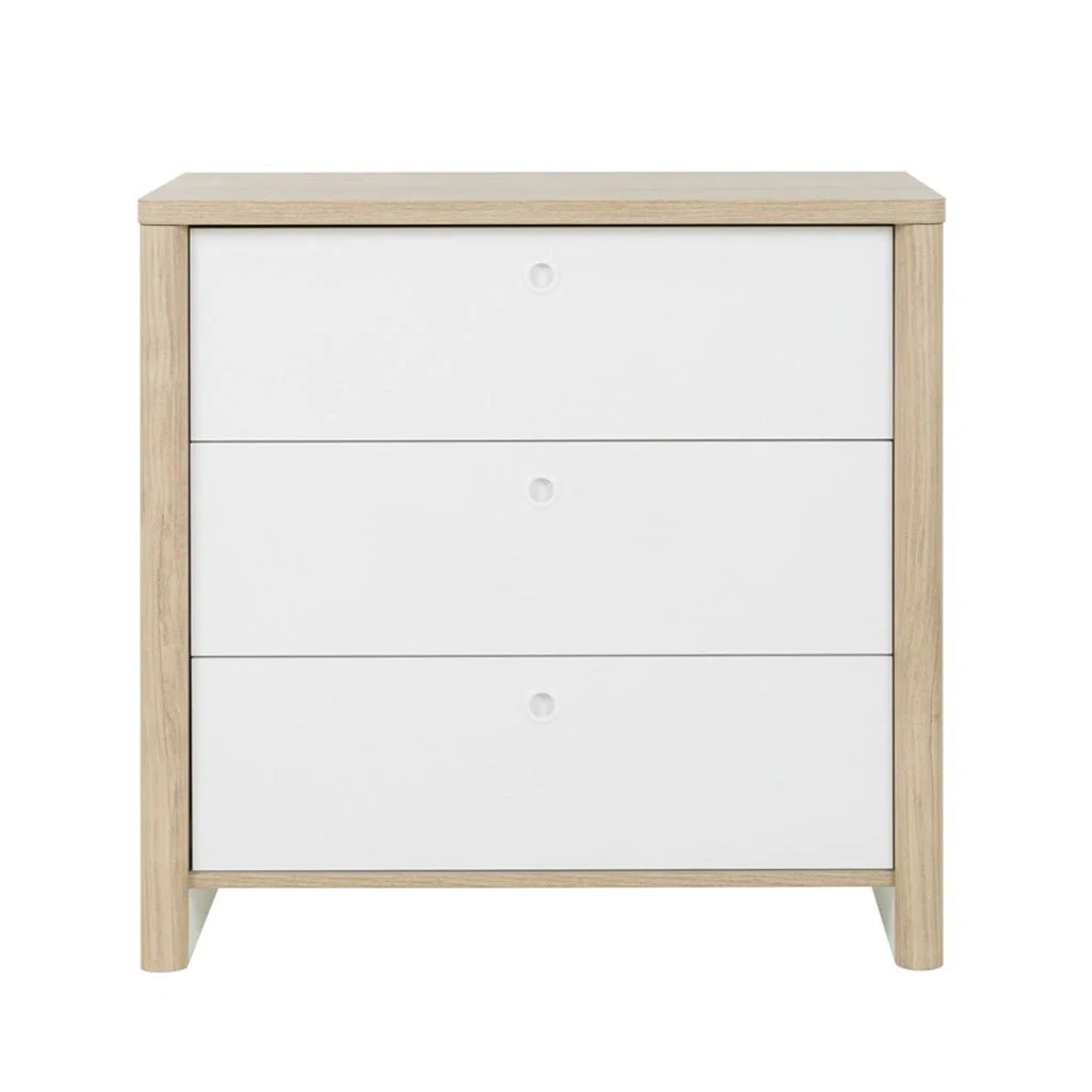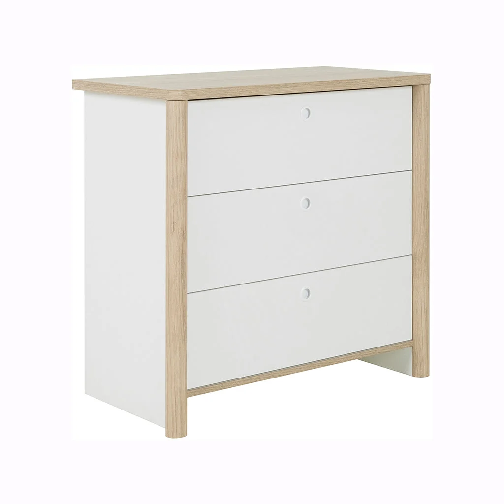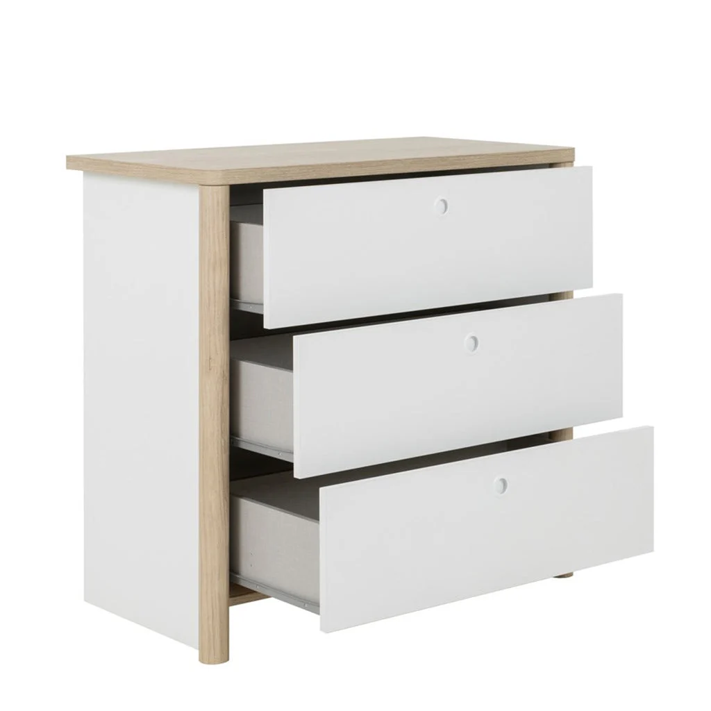 Description: Dresser with 3 drawers, color white/chestnut natural, wood material feet.