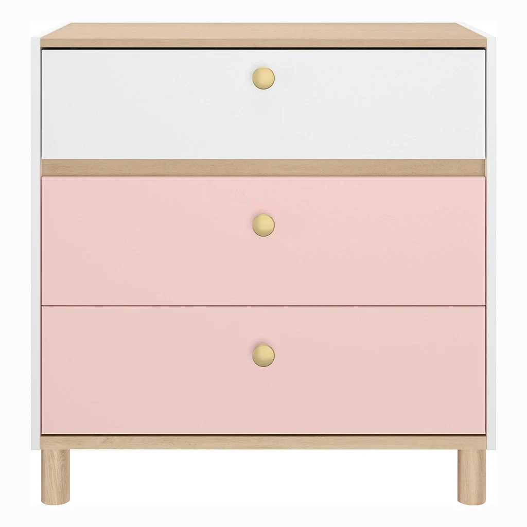 Description: Dresser with 3 drawers color pink/light oak/white. it has space for clothes, toys or books. Beautiful and child-friendly interior design style