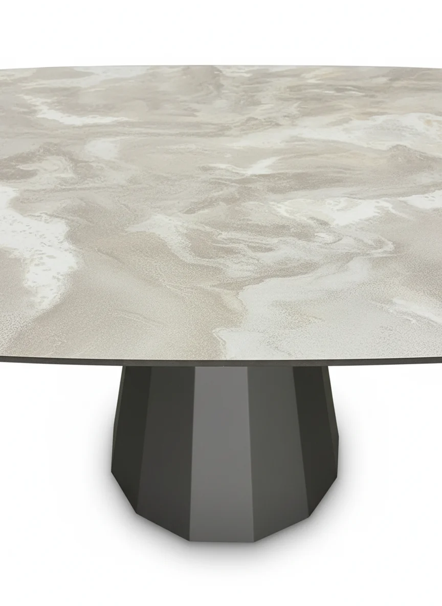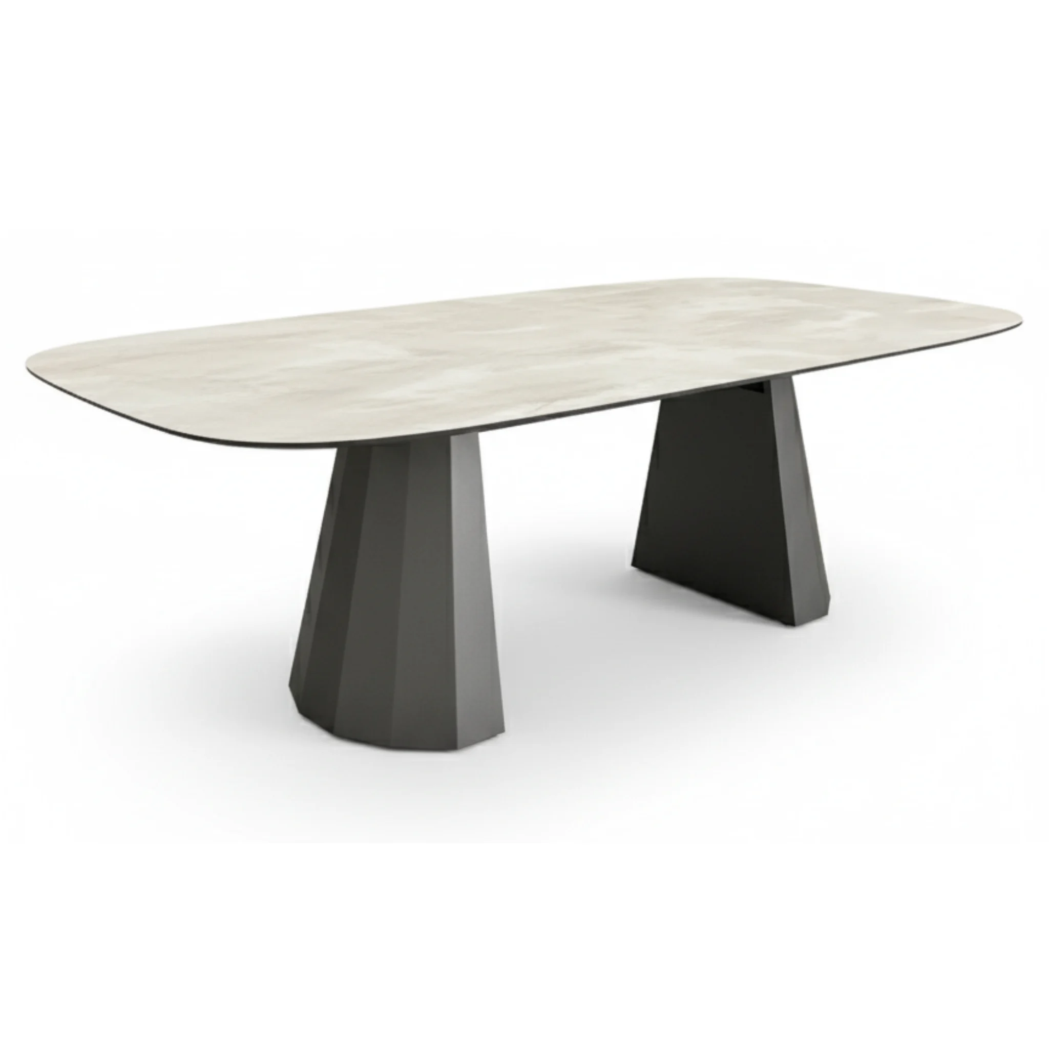 Description: Modern rectangular dining table featuring a medium-to-light grey, textured stone-look top with a clean, minimalist style, supported by two substantial dark metal legs.