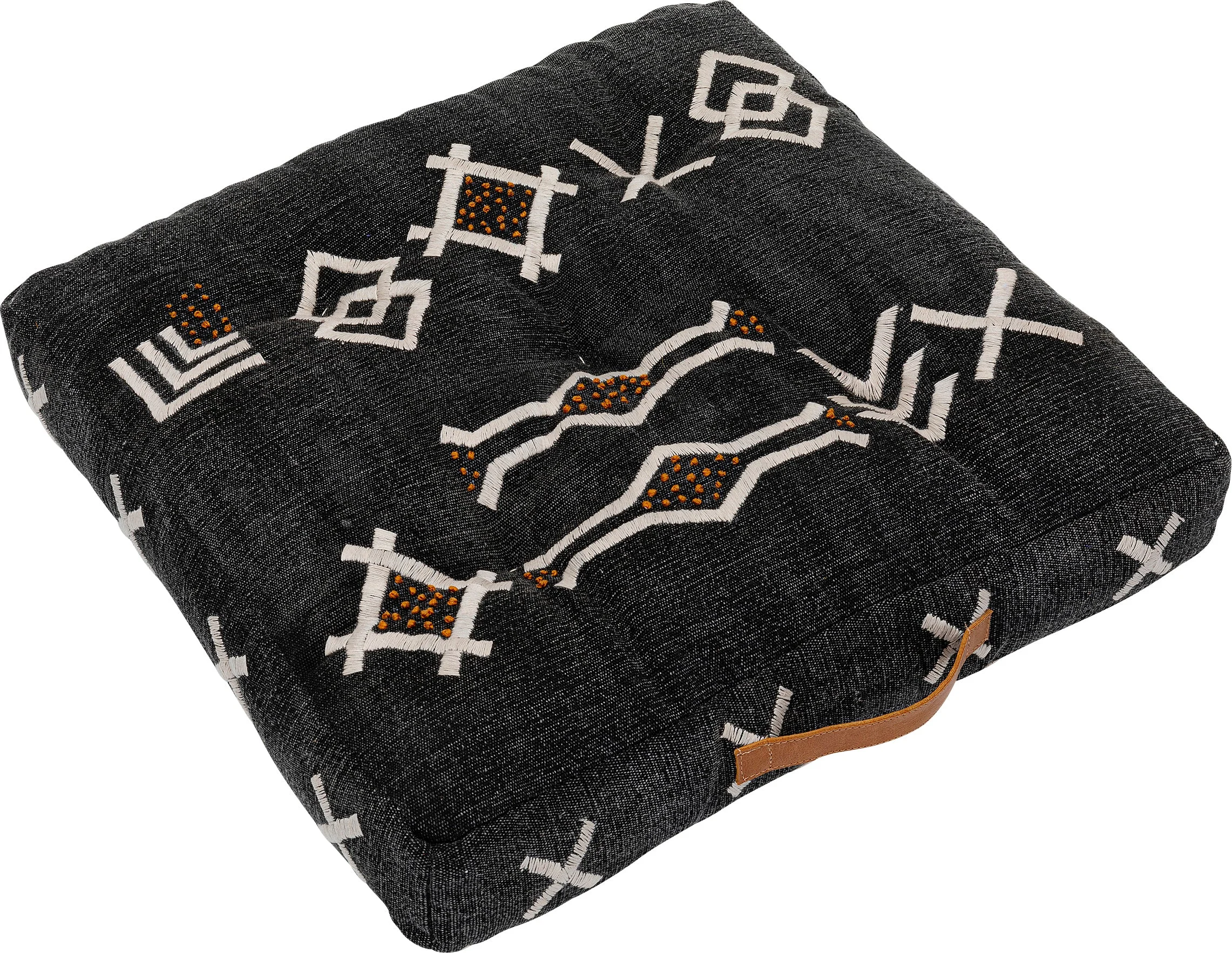 Description: Experience cozy comfort and artistry with the Floor Cushion Pittura. Each unique piece is hand-crafted and tufted for a touch of luxury. The cowhide split leather, polyurethane-coated handle adds a chic touch. Dry clean only for easy maintenance.