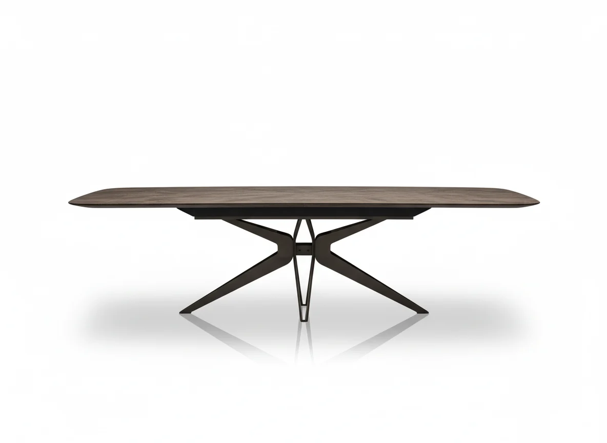 Description: Elegant modern dining table featuring a rectangular top with rounded corners and a light, natural marble-look finish. It is supported by a single, bold pedestal base with a striking angled design.