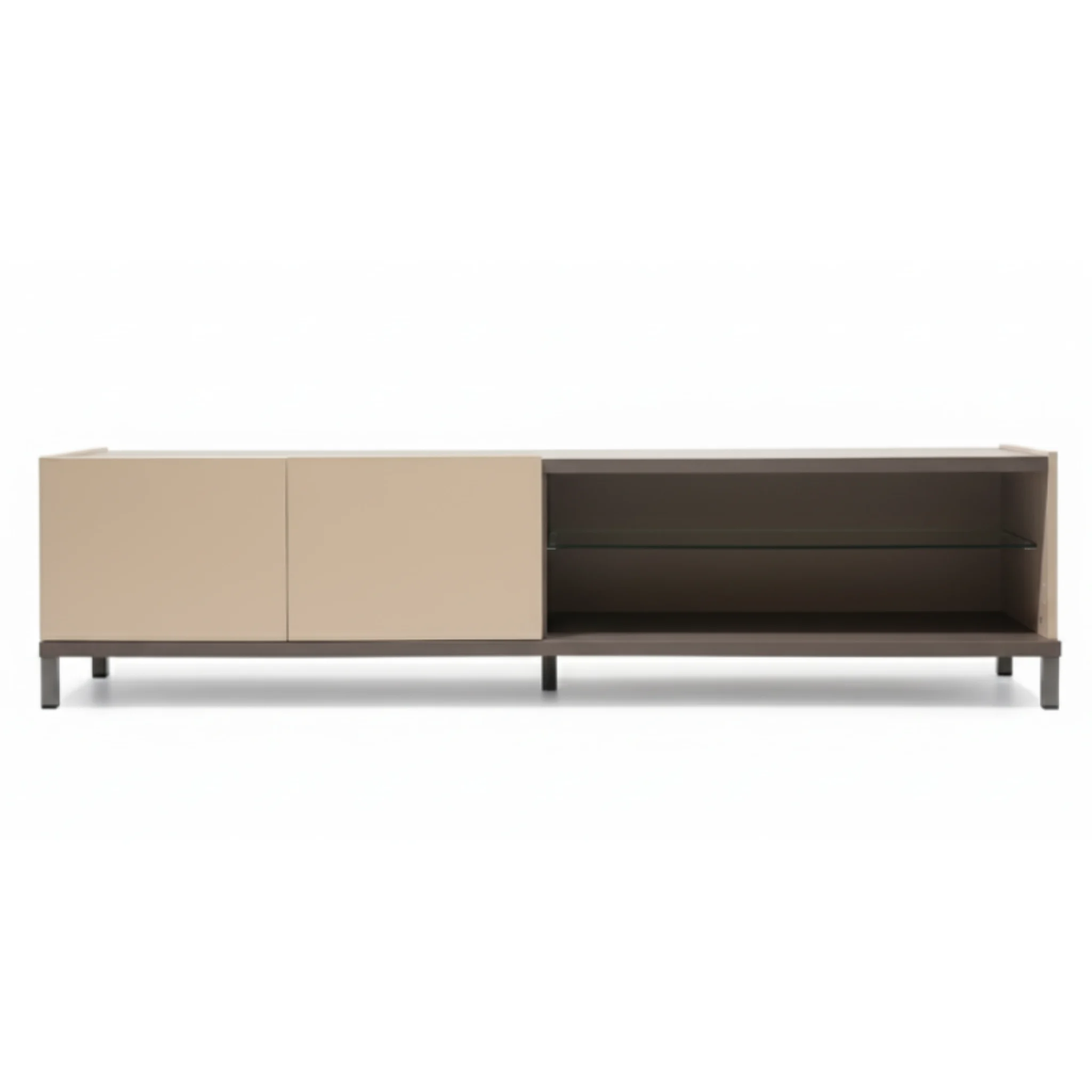 Description: This is a modern, low-profile TV console featuring a two-tone design with closed cabinet storage and open shelving, including a glass shelf, on dark metal legs.