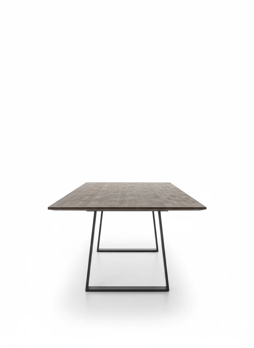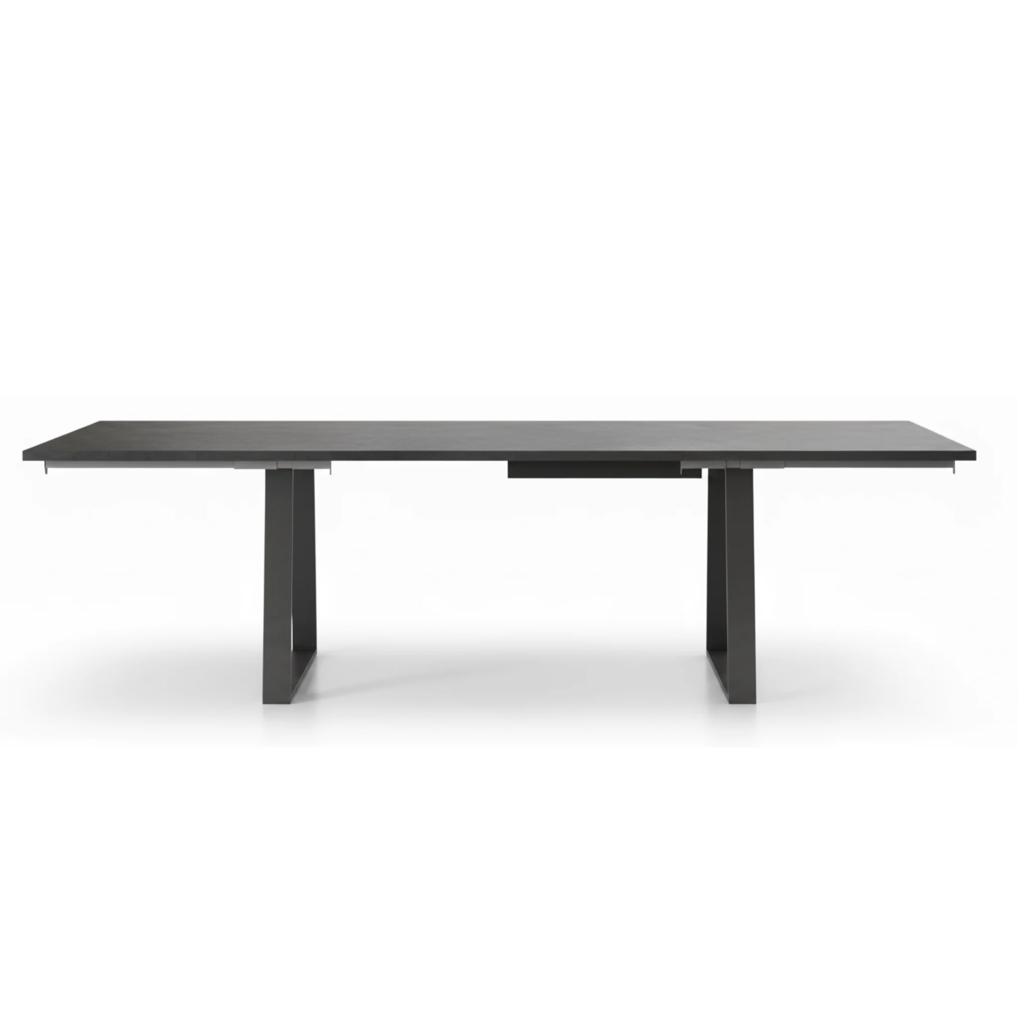 Description: Modern, extendable dining table featuring a light wood-grain top and a contrasting dark, matte-finish metal base, perfect for versatile use in contemporary spaces.