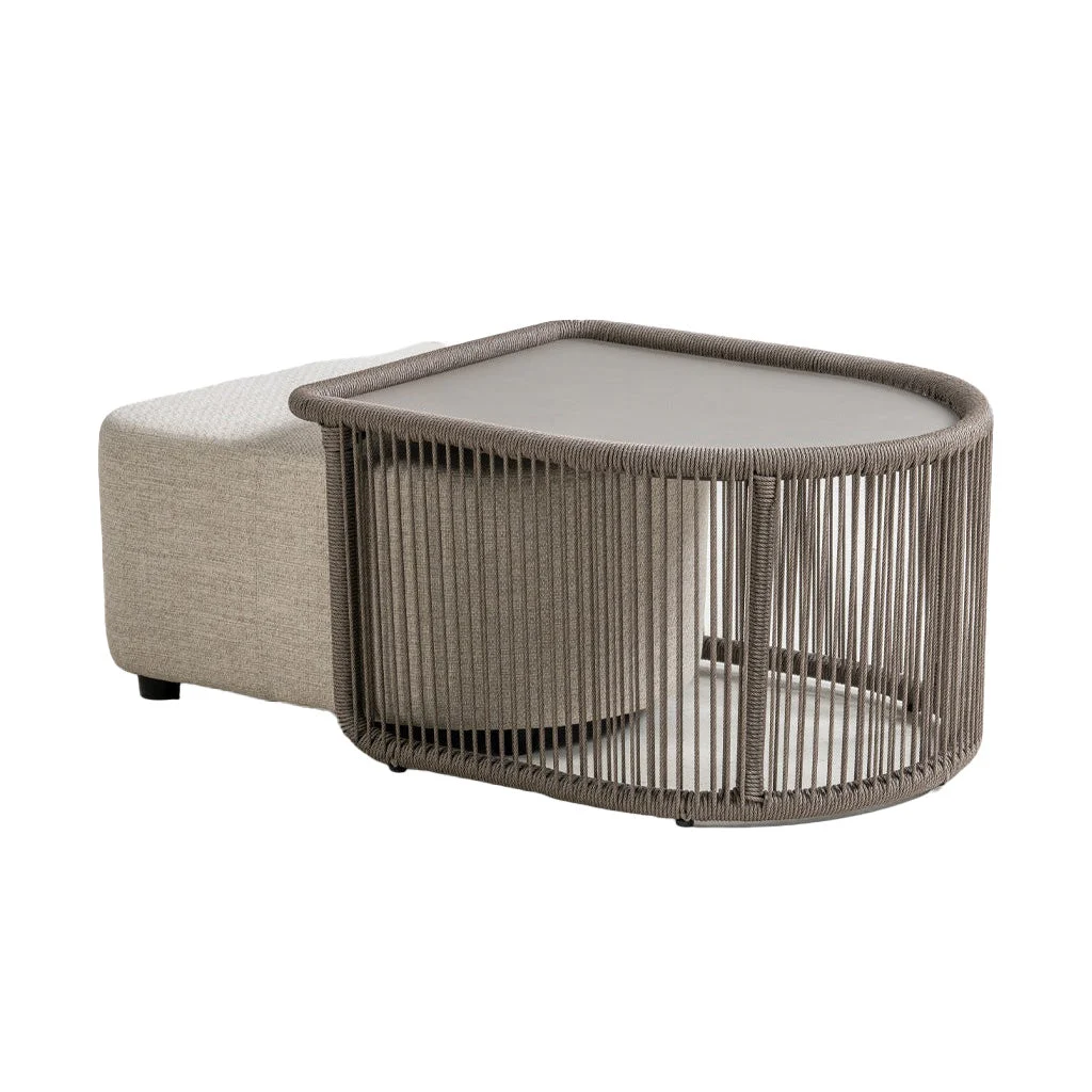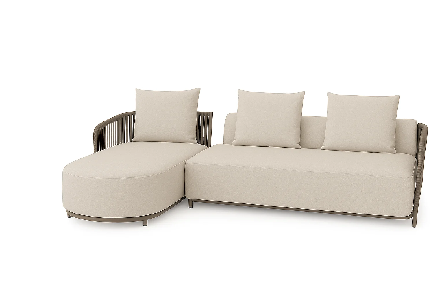 Description: Transform your outdoor living space with this modern beige outdoor sofa set, featuring a spacious L-shaped sectional, a cozy armchair, and a matching ottoman.
