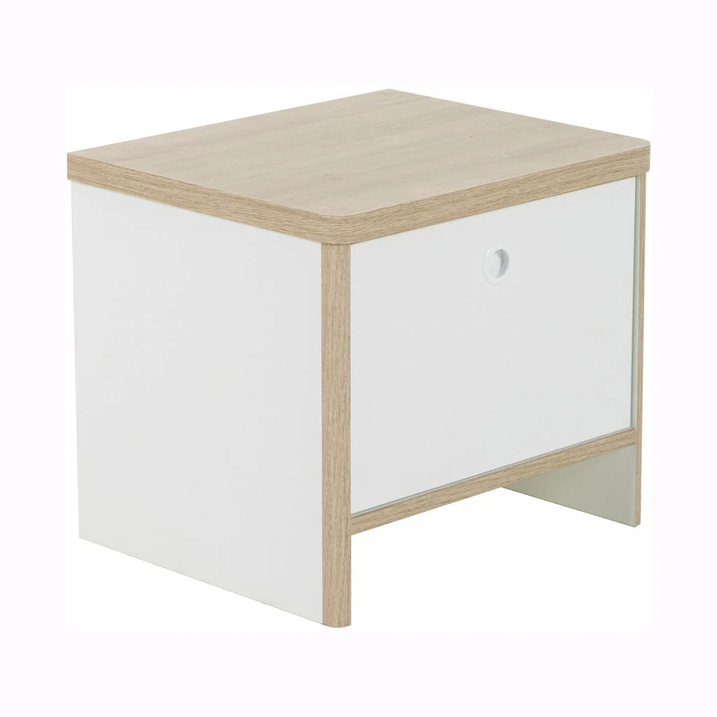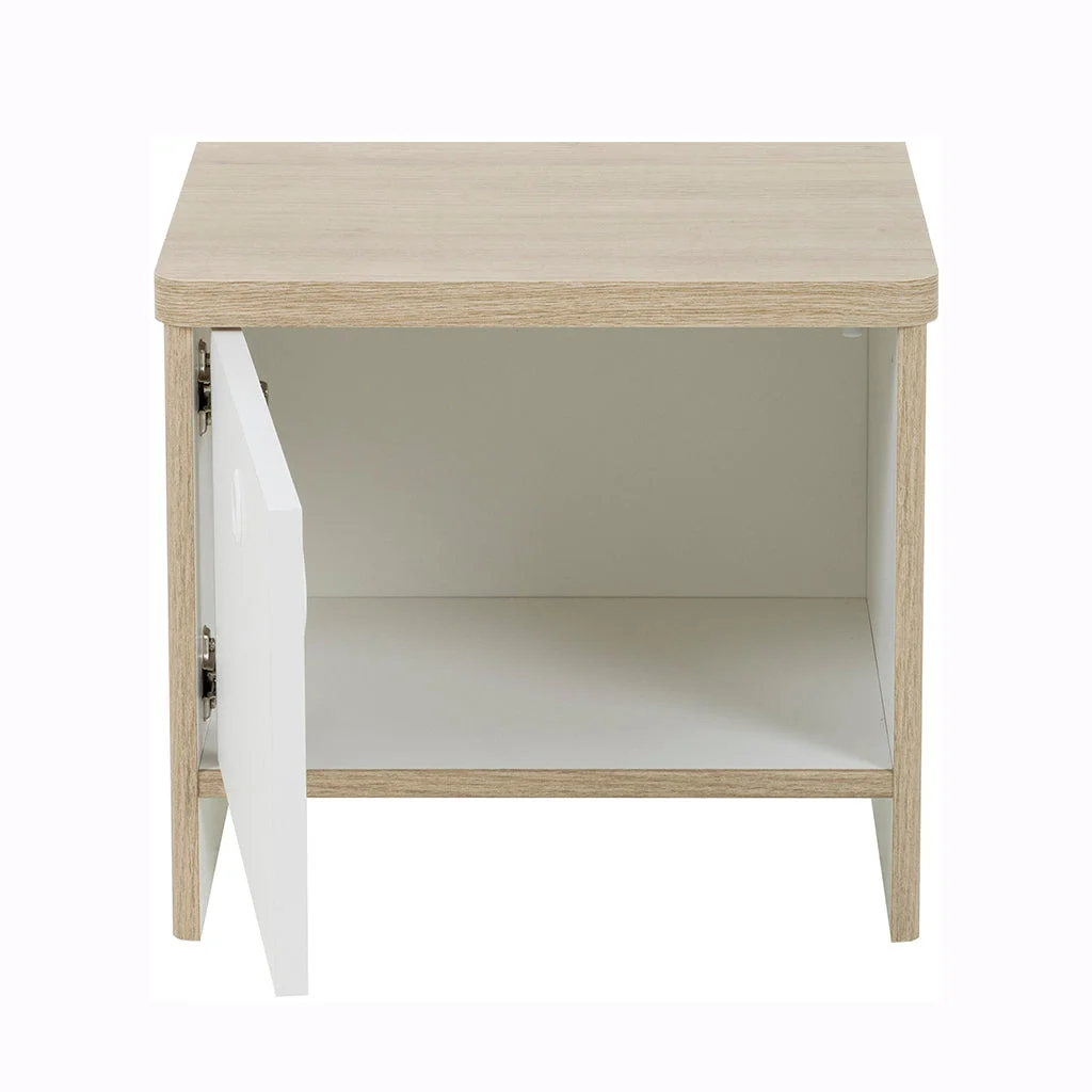 Description: Chic and smart nightstand with 1 door color white , oak wood type, coated finishing