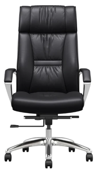 Description: Executive high-back office chair upholstered in leather with padded armrests. Designed with ergonomic support, adjustable height, and a chrome base.