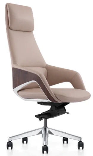 Description: Modern executive office chair featuring a high backrest with integrated head support, upholstered in brown leather for a sleek and professional look.