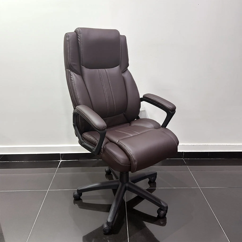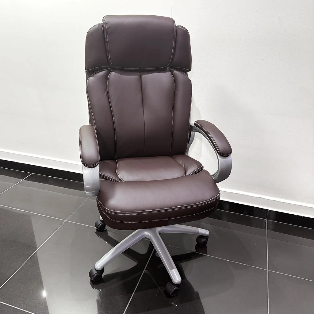Description:Comfortable brown leather office chair with cushioned support and fixed armrests, perfect for long work hours.