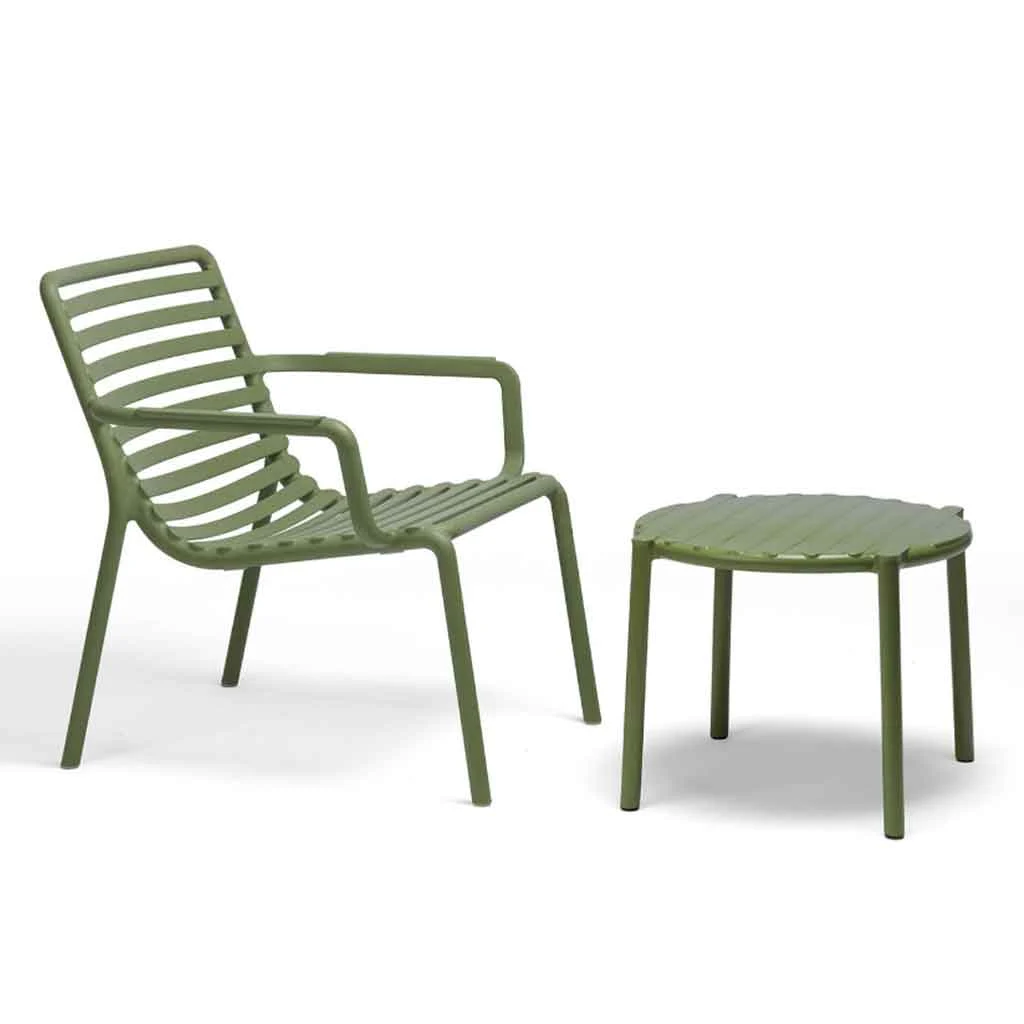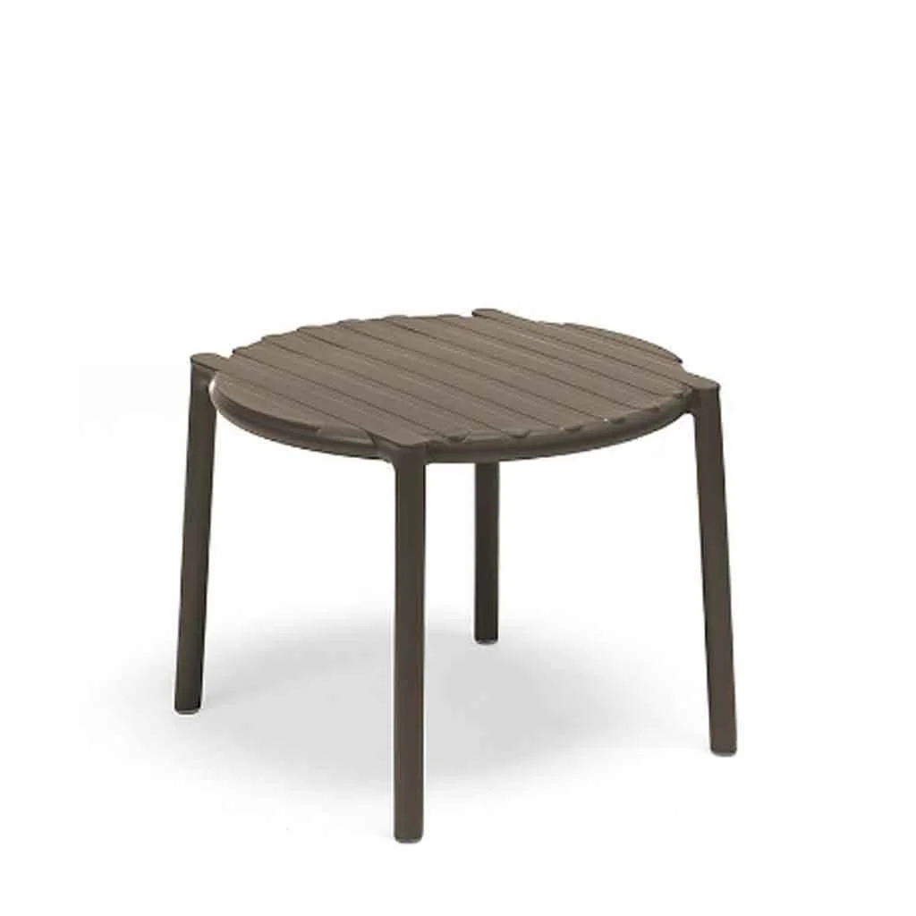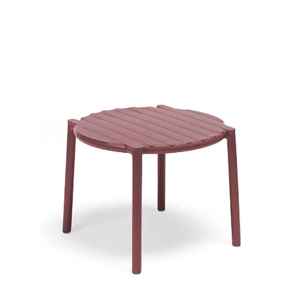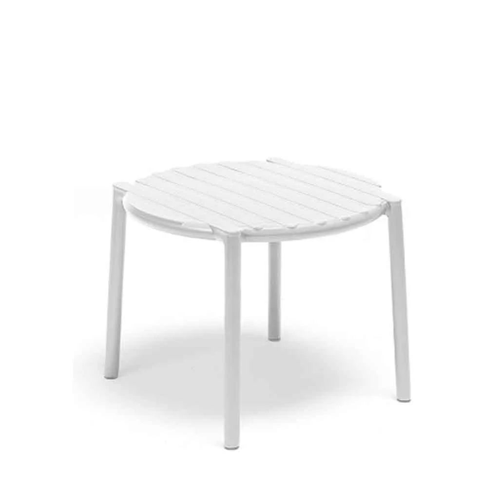 Description: The slatted design is given a contemporary look for the Doga table, a monobloc low table in fiberglass resin with a round top and a new, lightweight design. It is handy to move, stackable, easily sanitized, and entirely recyclable.