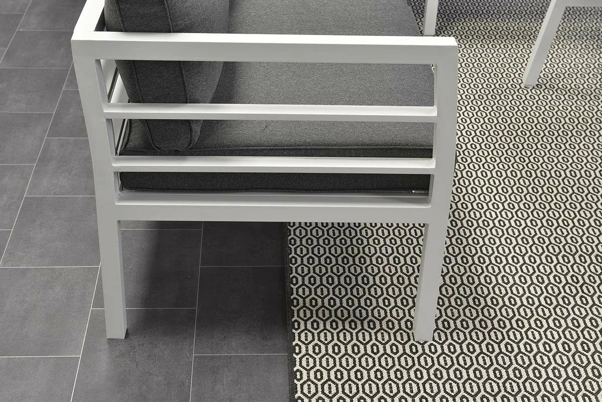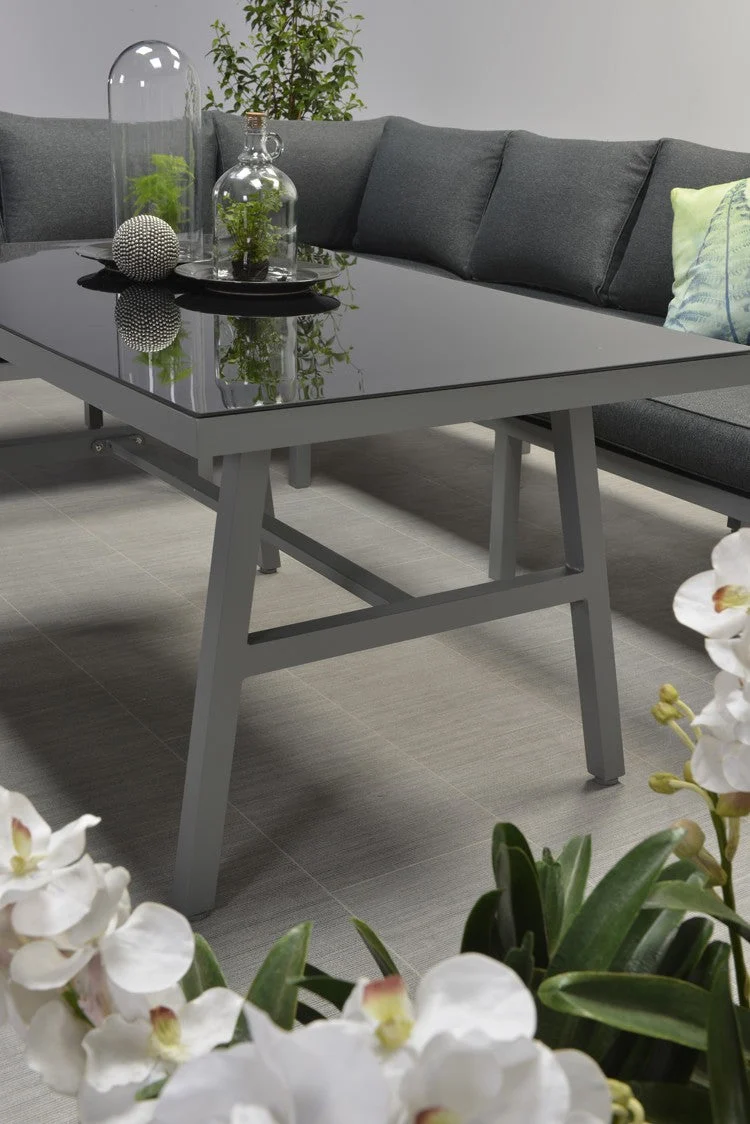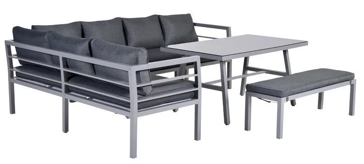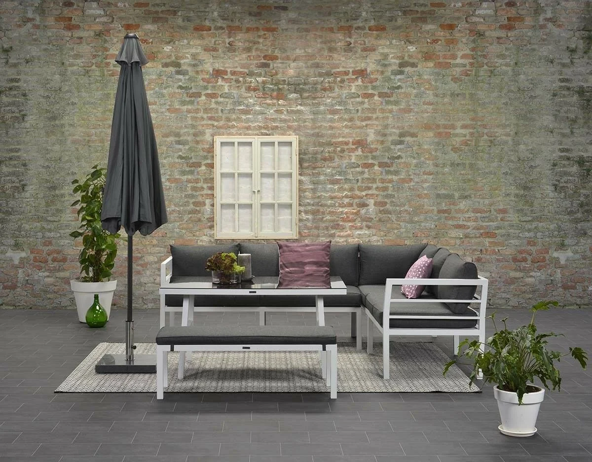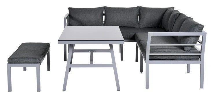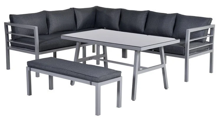 Description: Corneroutdoor set with a high table and a bench made of aluminum.