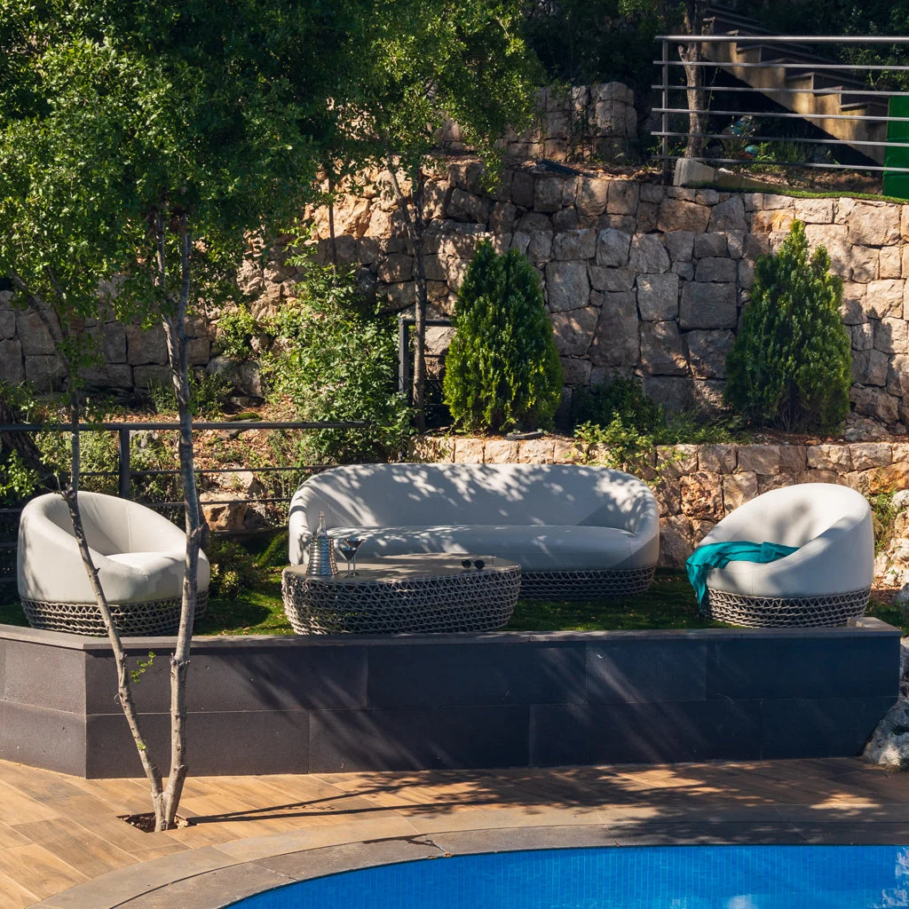 Description:Garden lounge set with a 3-seater sofa, 2 armchairs, and 1 coffee table. Made with an aluminum structure.