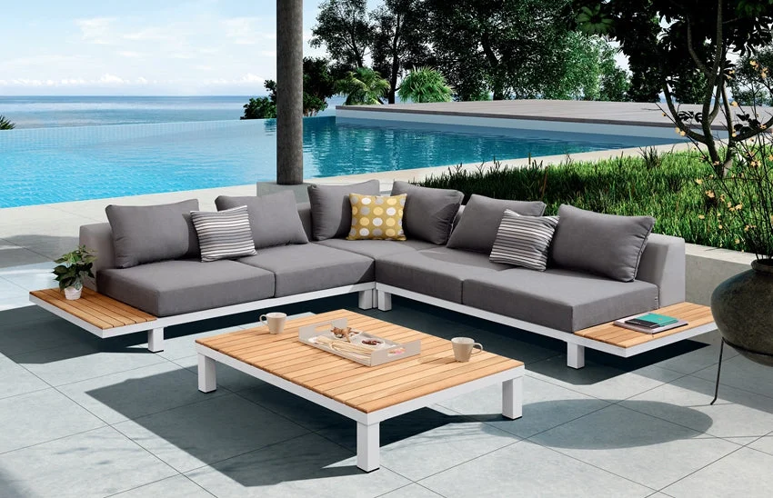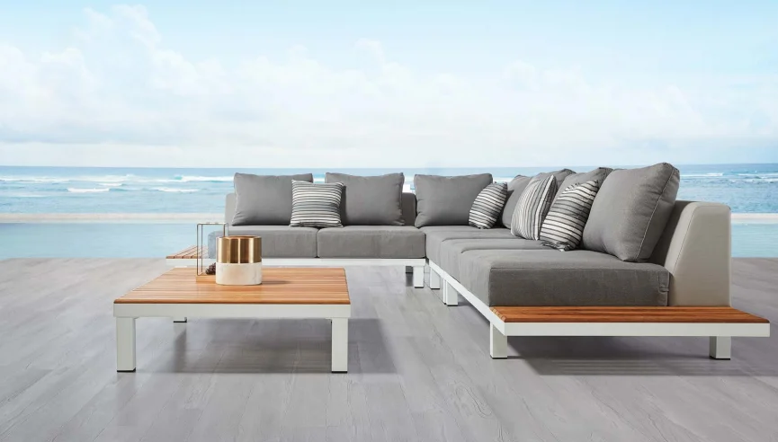 Description:Polo is a modular lounge set that can be assembled into different configurations. Thick upholstery and cushions make Polo with more comfort and coziness. With quick dry foam covered by textilene material being served as the back rests, it has balanced the principles between long-lasting usage and softness. Natural wooden elements assembled at the end of the lounges serve as side tables to hold lighting accessories and etc..