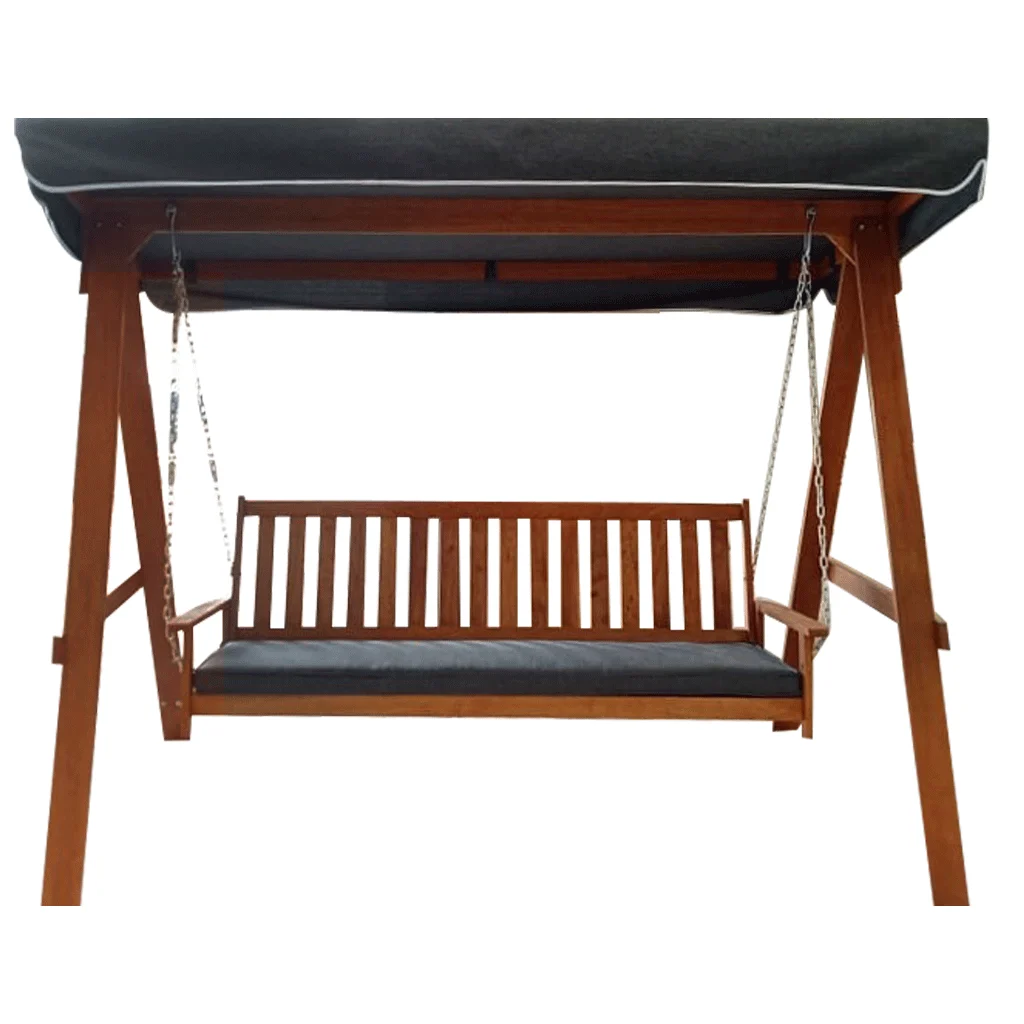 Description:3 seater wooden outdoor swing with customizable fabric.