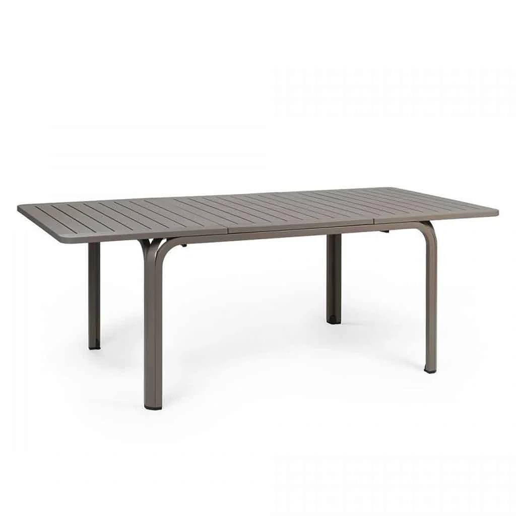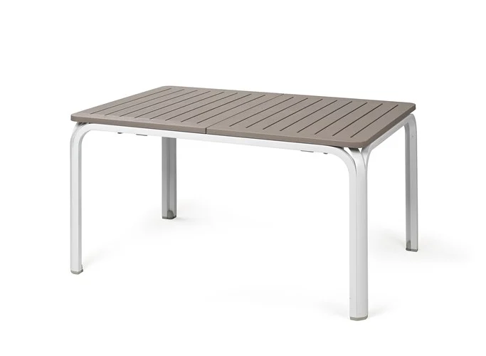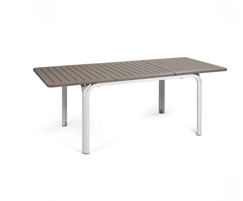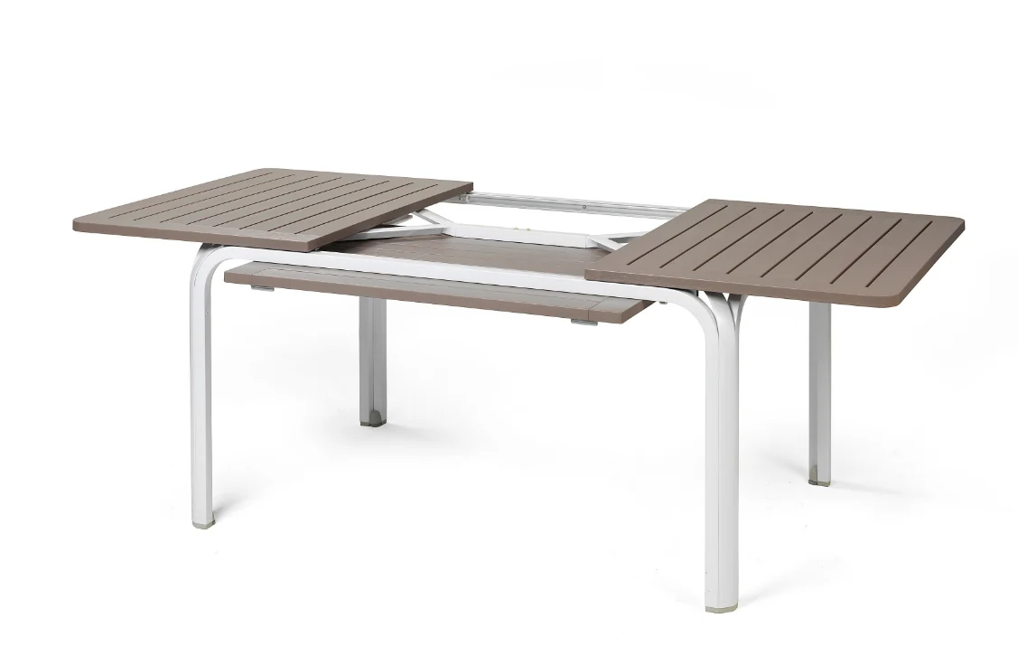 Description: Extensible table. Top Duel TOP in polypropylene with UV additives and uniformly colored. Legs in coated aluminum. Matt finish. Recyclable resin.