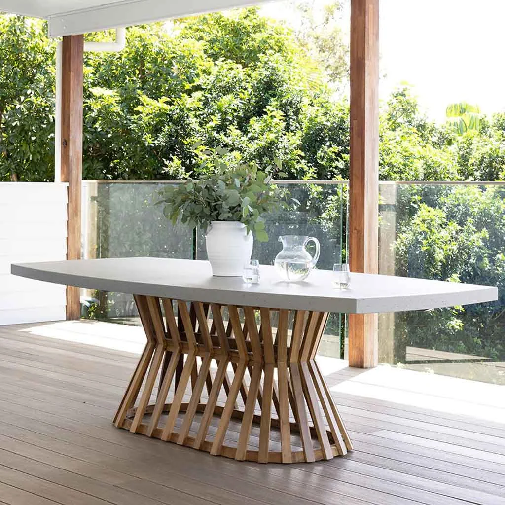 Description: Outdoor table with a concrete top and teak base.