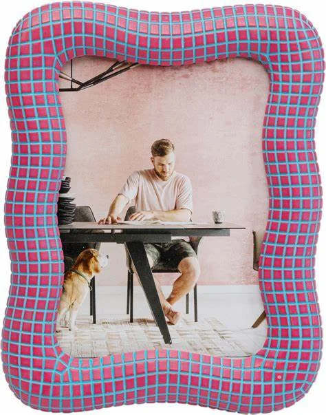 Description: Bold and playful photo frame with a wavy silhouette and eye-catching pink-and-blue grid pattern. Perfect for showcasing , it adds a pop of color and retro charm to desks, shelves, or bedside tables. Ideal for eclectic or modern interiors.