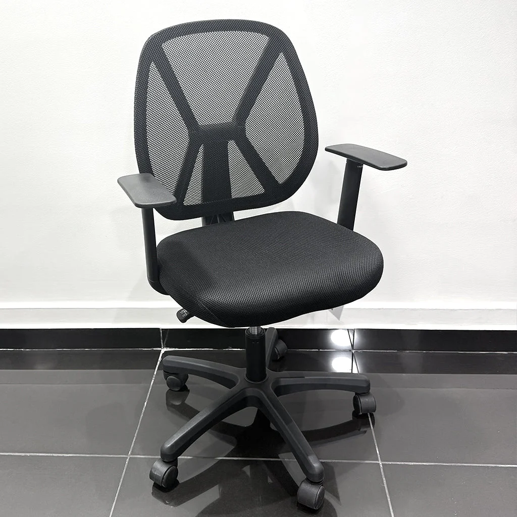 Description: Compact and breathable mesh office chair with fixed armrests and a supportive backrest design. Features a cushioned seat, swivel base, and smooth-rolling wheels ideal for home offices, study areas, or minimalist workspaces.