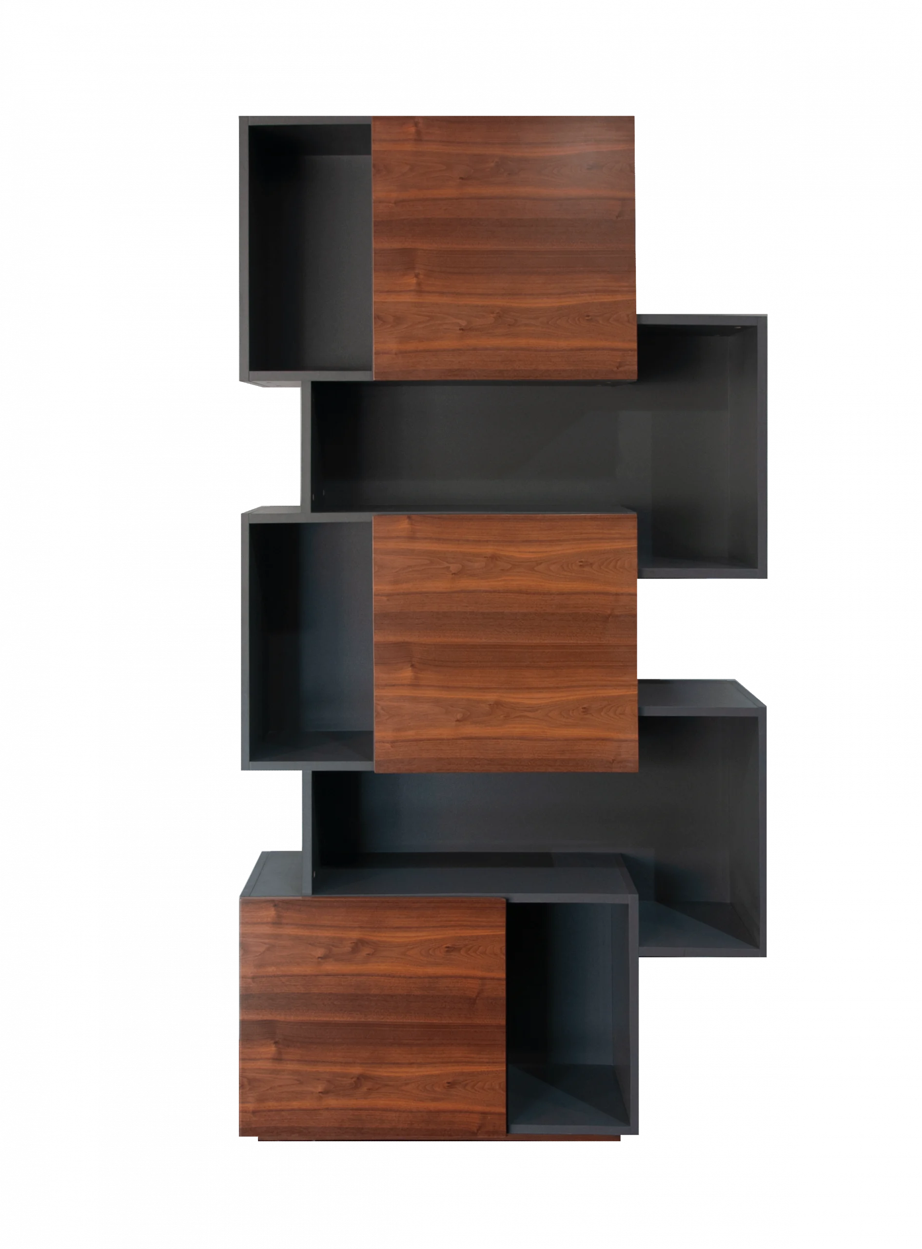 Description:Dark grey wood rectangles with 3 walnut doors.