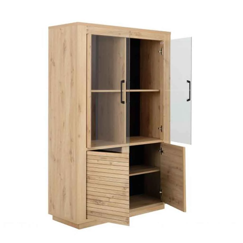 Description: Frame and fronts: particle-board covered with artisan oak effect foil. Edges with the same finish, some ABS, some rounded. Digital printing on some parts. Black metal handles.