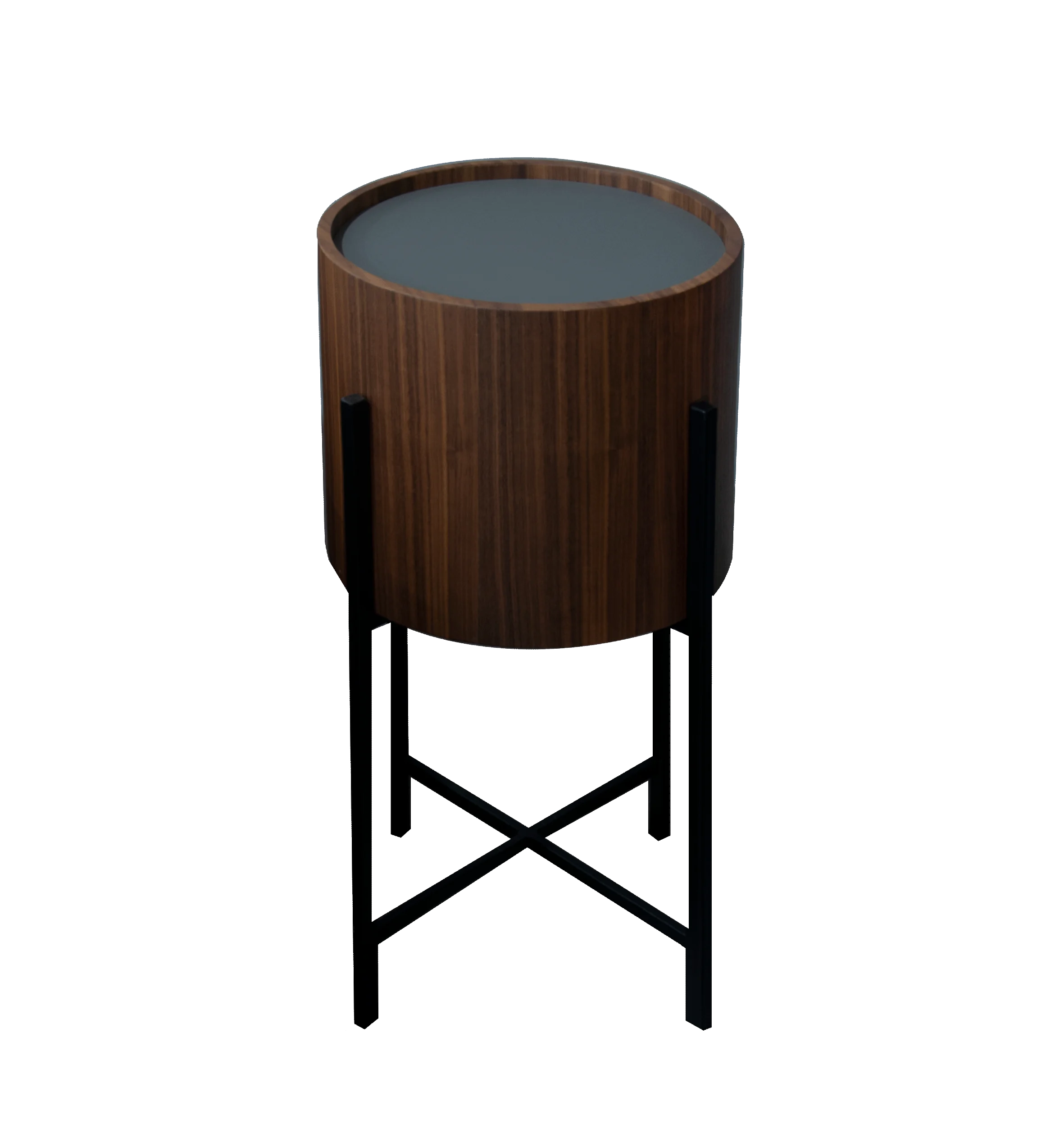Description: Phone table made of wood and black steel legs.