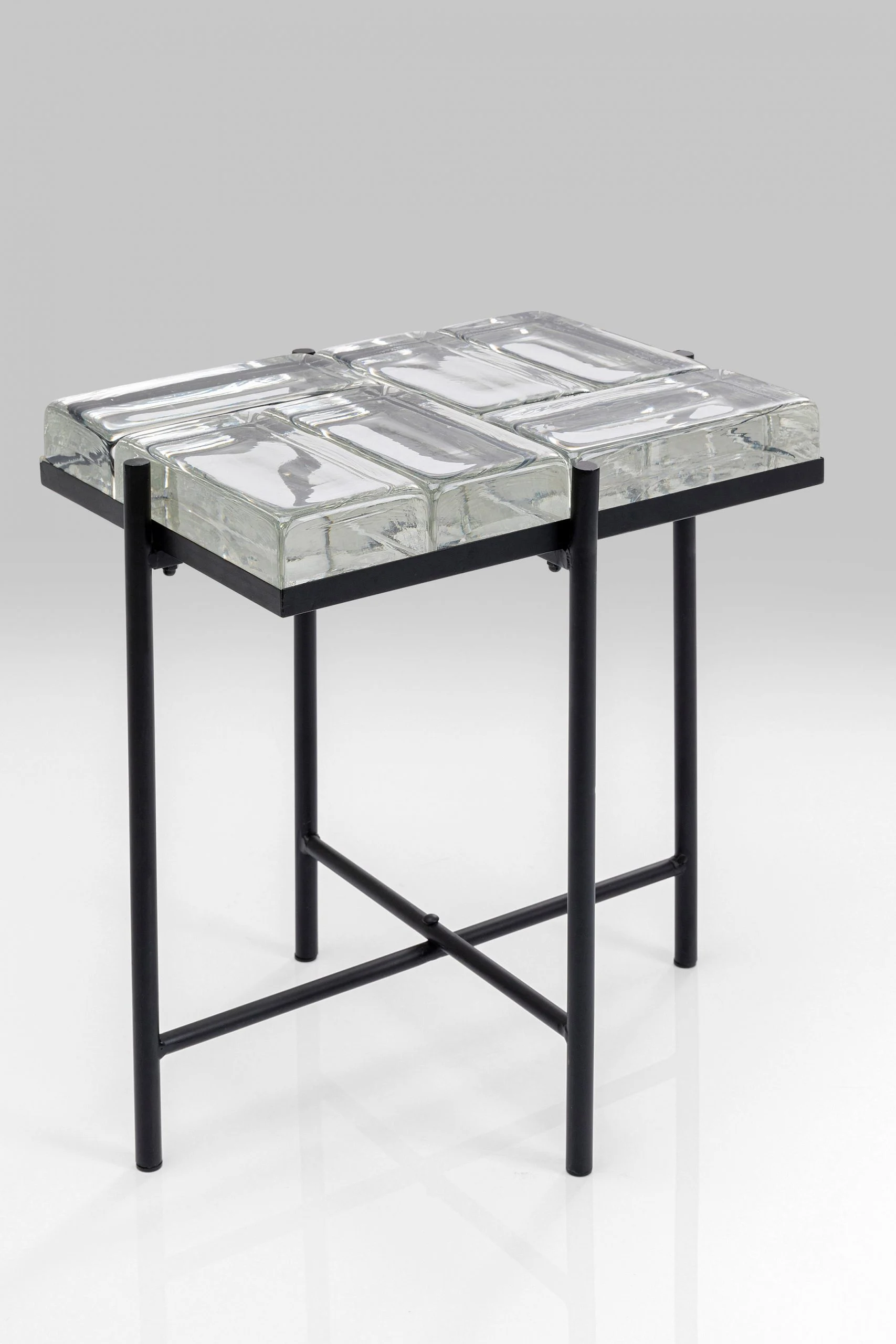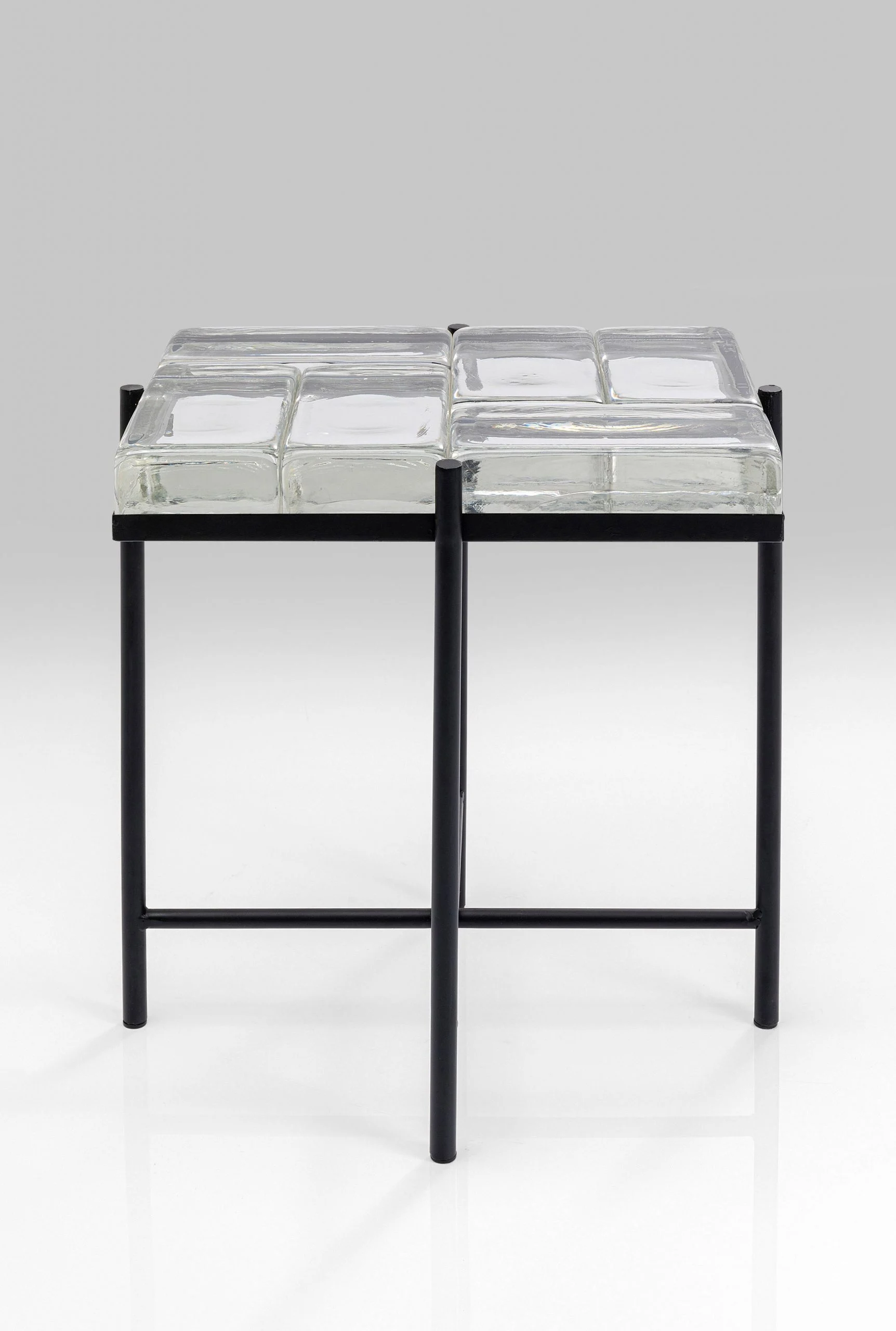 Description: The table top in an ice cube look defines the exclusive design of the black side table. The thick glass elements and the stable metal frame make the glass table versatile. Whether in the living room as a coffee table for your favorite books, snacks and the remote control or in the bedroom as a bedside table – this side table will be a striking highlight in any living area.