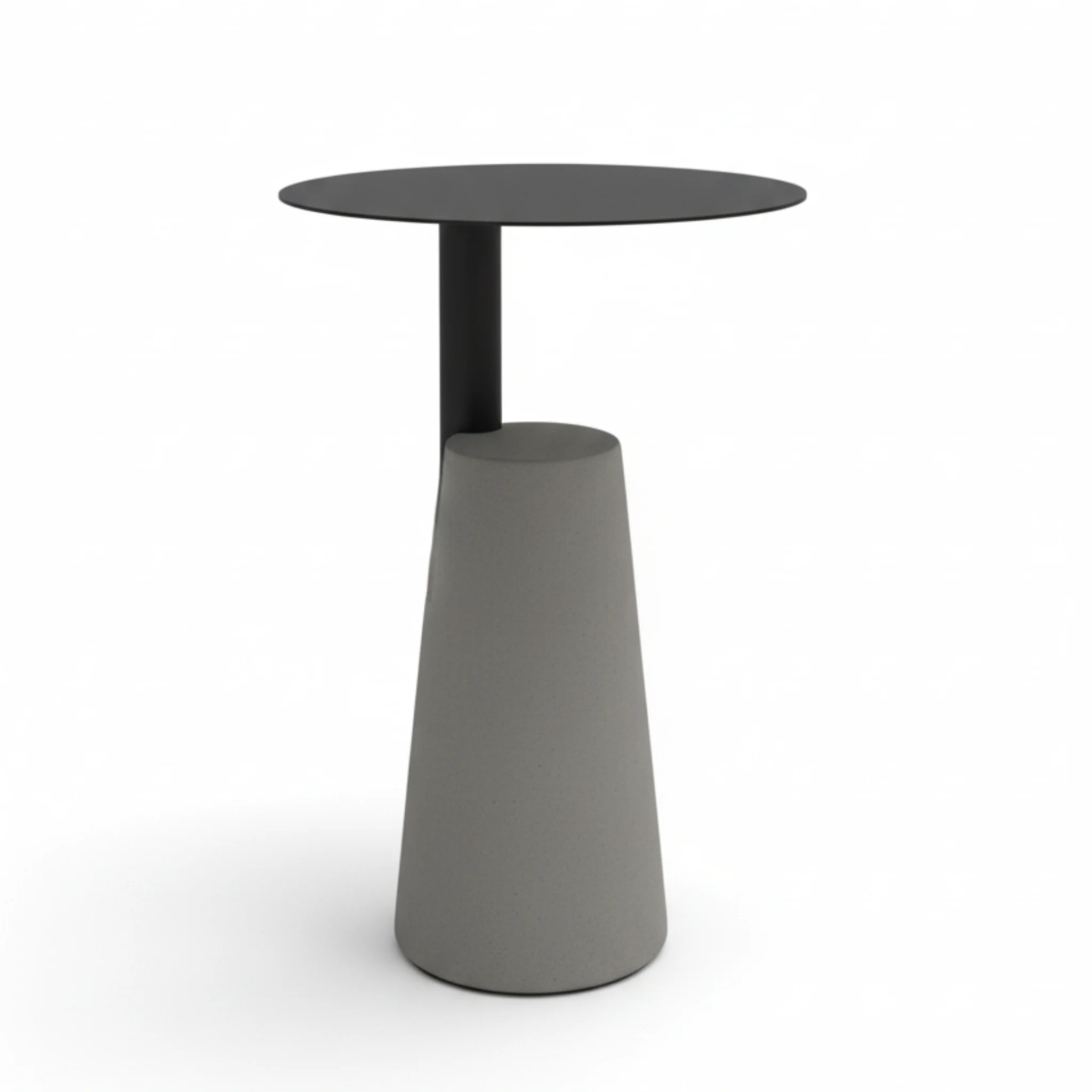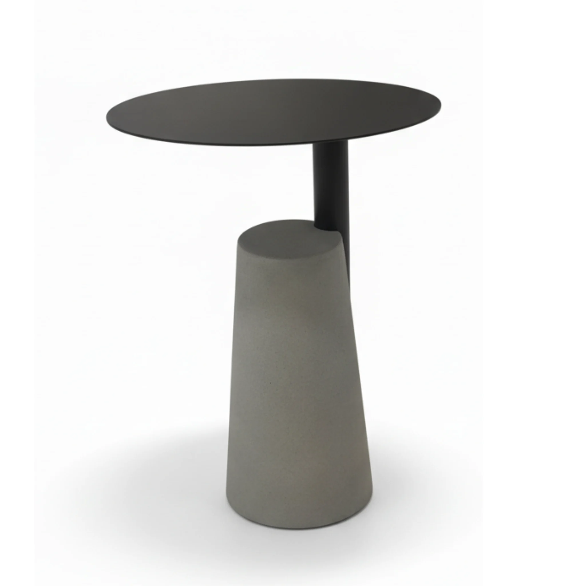 Description: Unique and sculptural end table with a striking visual contrast between its solid, textured grey pedestal base and the thin, minimalist black disc top, perfect for modern interior design.