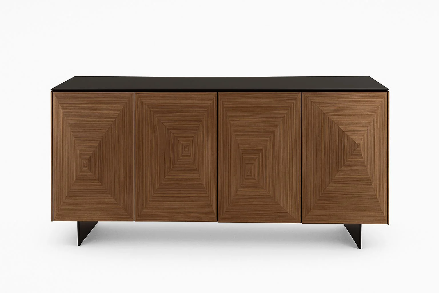 Description: Elegant wooden sideboard featuring geometric patterned doors, a sleek black top, and sturdy legs, offering both modern style and practical storage for any living or dining space.