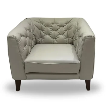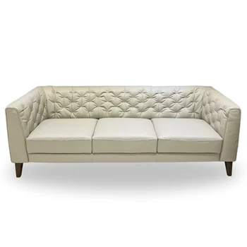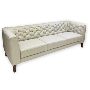 Description: A three-piecelight leather sofa set featuring a button-tufted design.