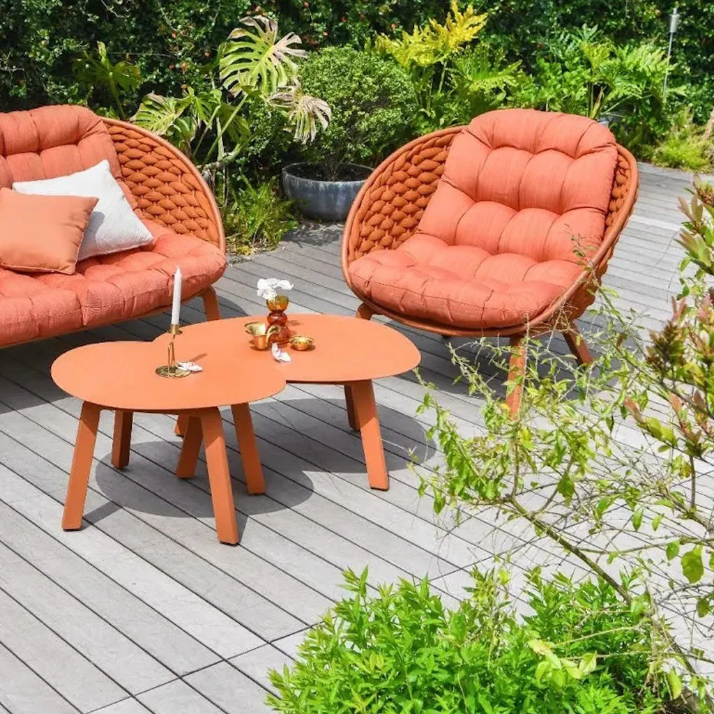 Description: Transform your garden or patio into a cozy retreat with this contemporary outdoor sofa set in warm terracotta orange. Featuring a 2-seater sofa, two deep armchairs, and a stylish dual-level coffee table, this set combines comfort, design, and durability.