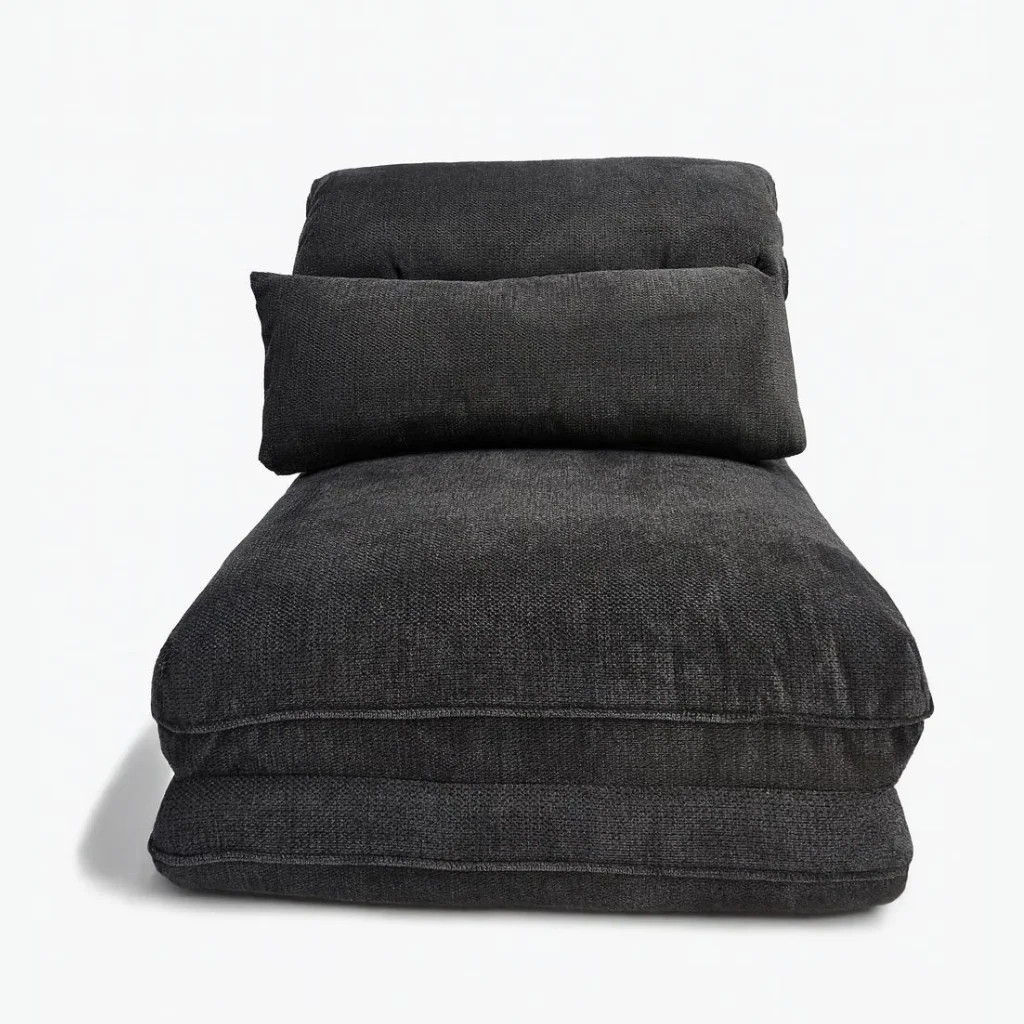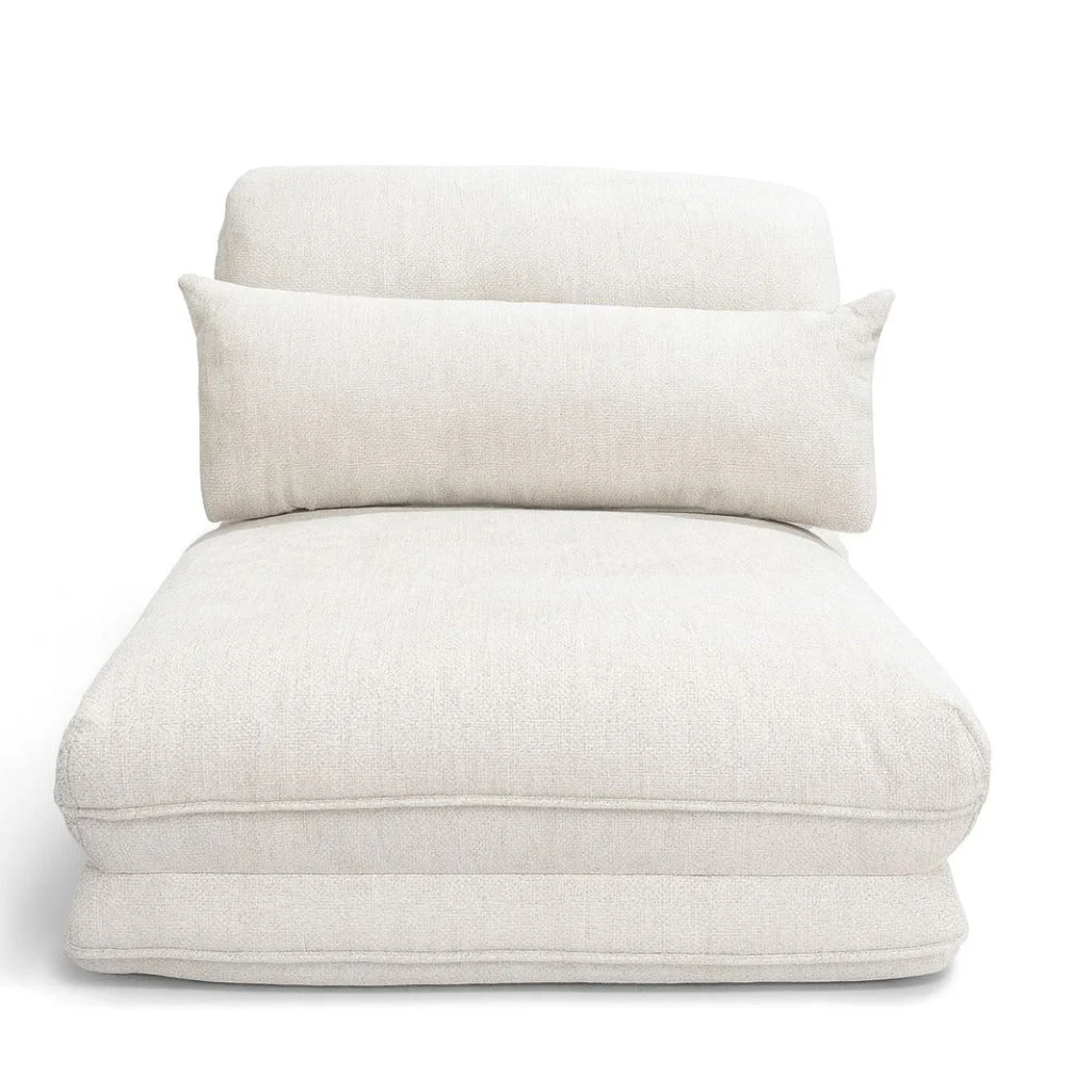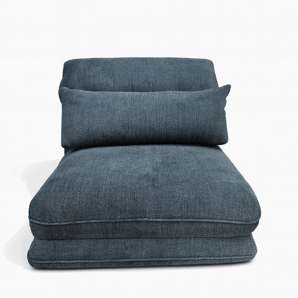 Description: A contemporary armless lounge chair upholstered in a rich, fabric with a textured finish. It features an extra-wide, low-profile design with thick, layered cushioning for maximum comfort.