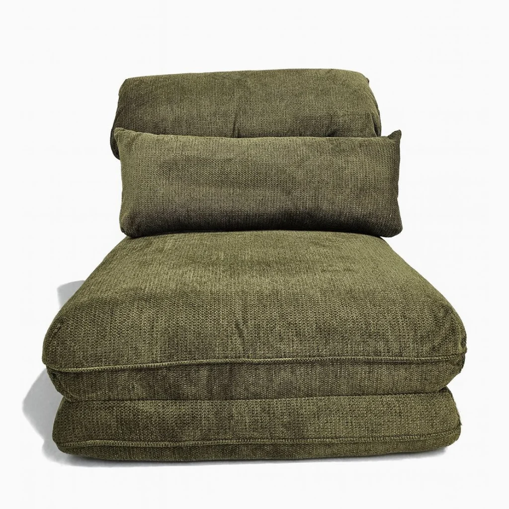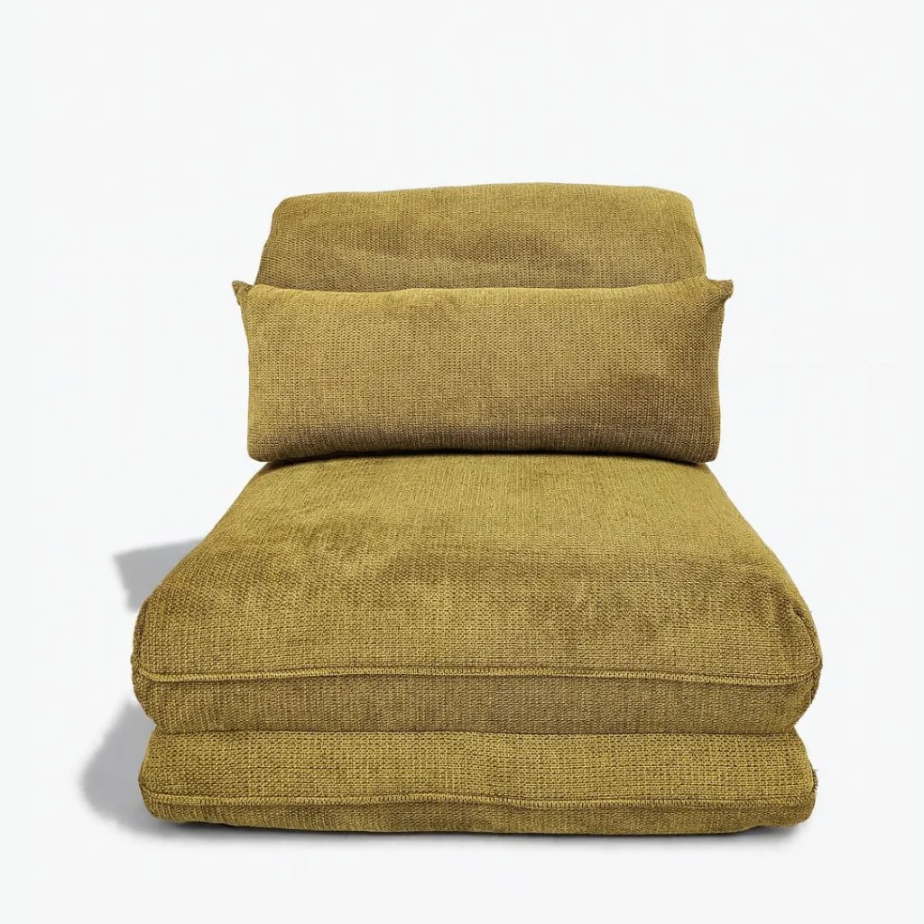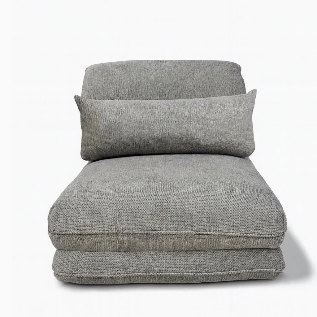 Description: A contemporary armless lounge chair upholstered in a rich, fabric with a textured finish. It features an extra-wide, low-profile design with thick, layered cushioning for maximum comfort.