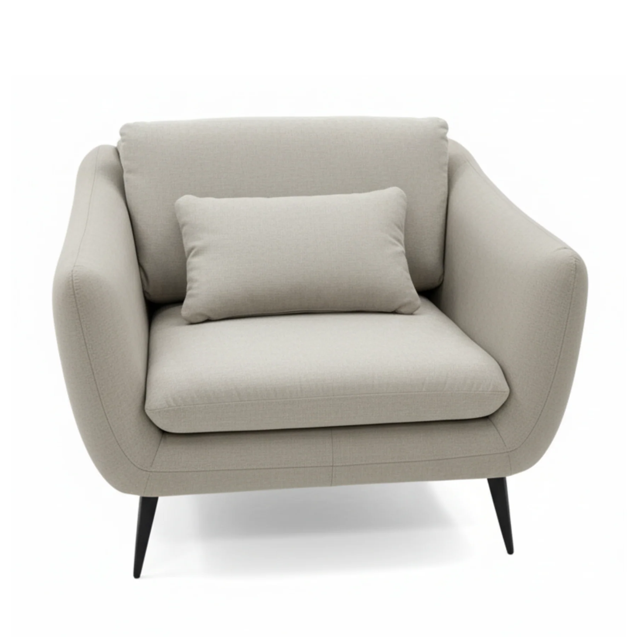 Elegant and compact, this neutral-toned upholstered accent chair offers a cozy seating option with a sleek, rounded design and tapered black legs.