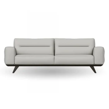 Description: Modern sofa in a light color offering a clean, striking silhouette with a distinctive wood-trimmed base.