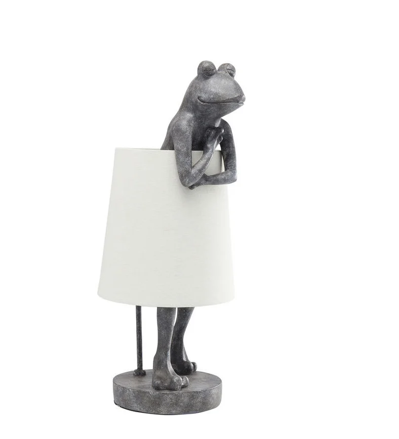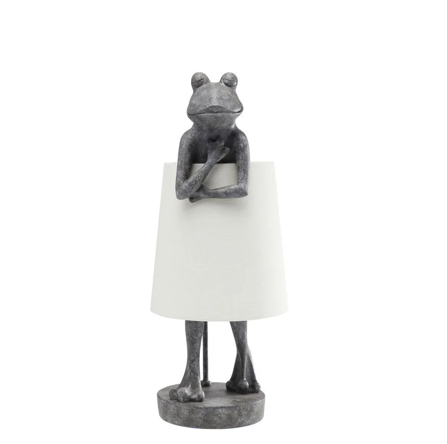 Description:Poly resin grey frog table lamp with a steel powder coated base.