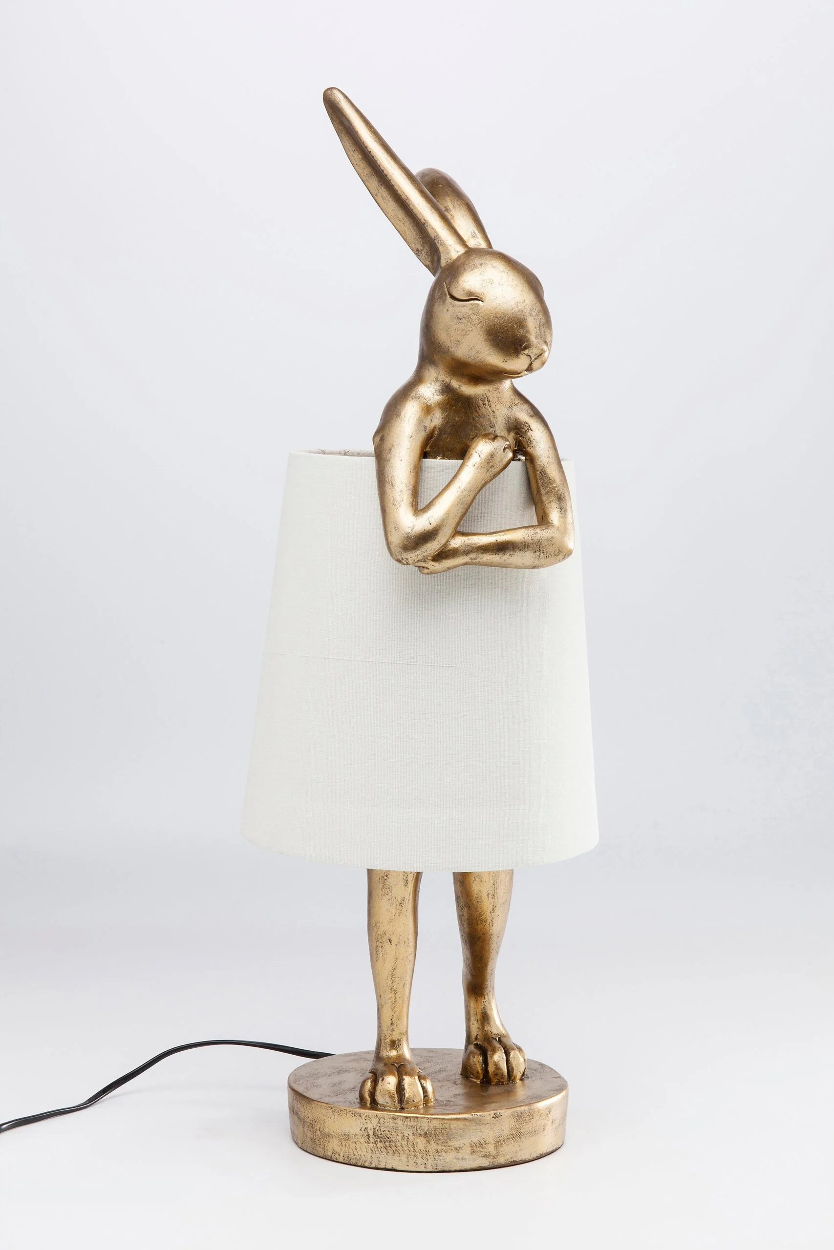 Description: The way the cute golden bunny supports the lampshade in a charming way. Such favorite pieces add a lot of personality and are the reason why an apartment becomes a home. 230 V, 50/60 Hz, illuminant make LED, bulb fitting E14, number of illuminant 1, max. 5 watt, without illuminant, replicable illuminant