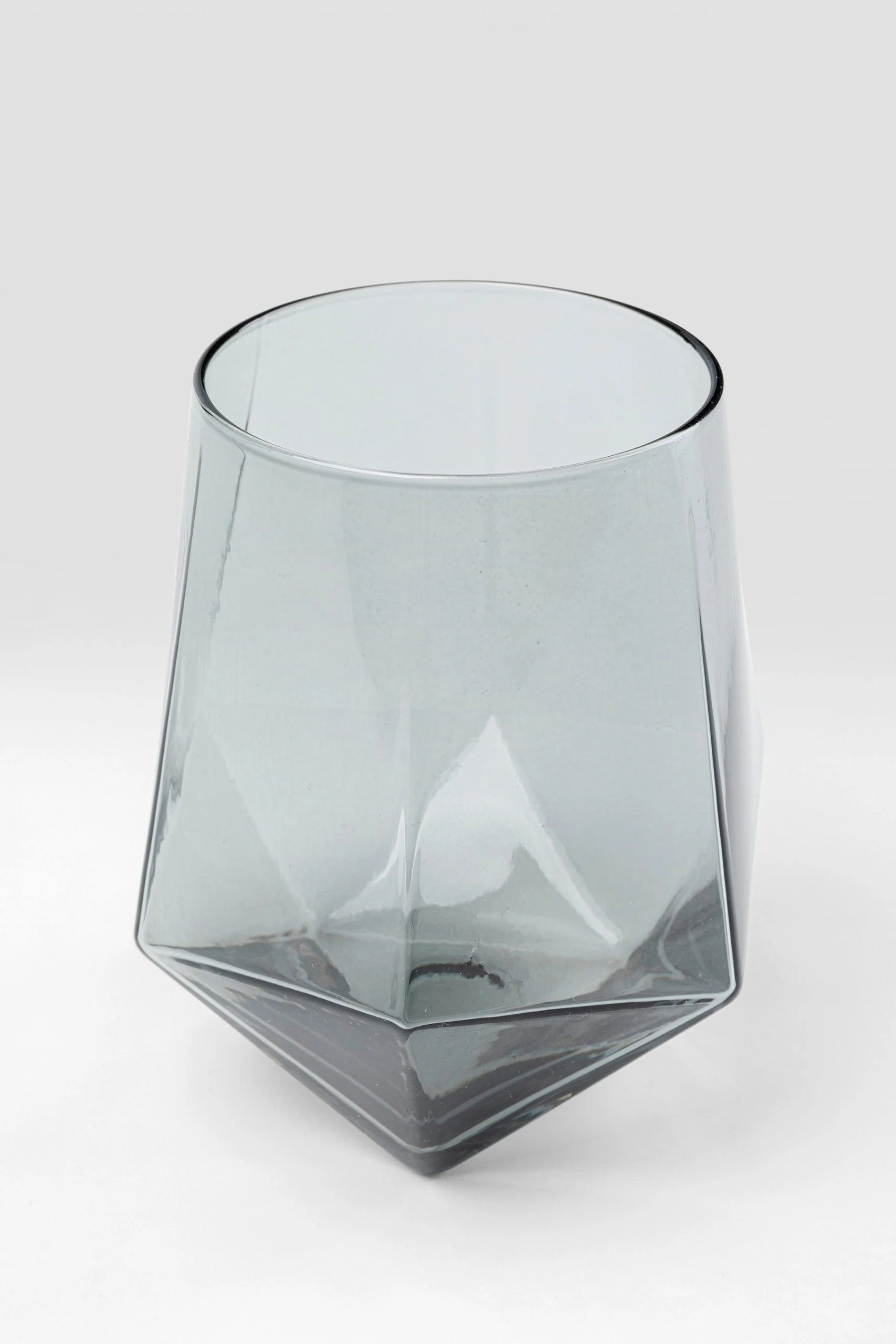 Description: The Tumbler Diamond Smoke is a distinctive drinking glass, crafted from colored glass and featuring a unique smoky grey tone with a diamond-like, rough-worked texture