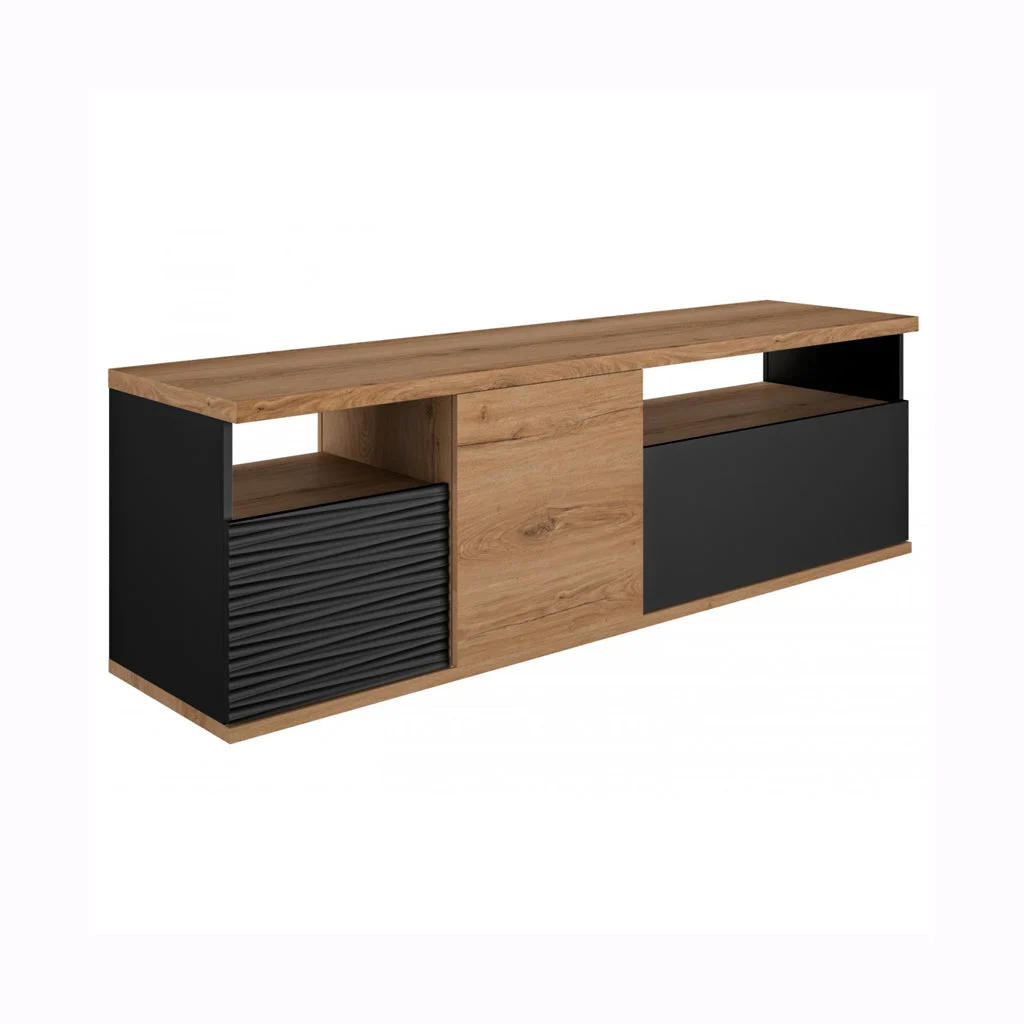 Description: TV stand has a door and a drawer with soft-close mechanisms, and the color is a wonderful combination of helvezia oak and black.
