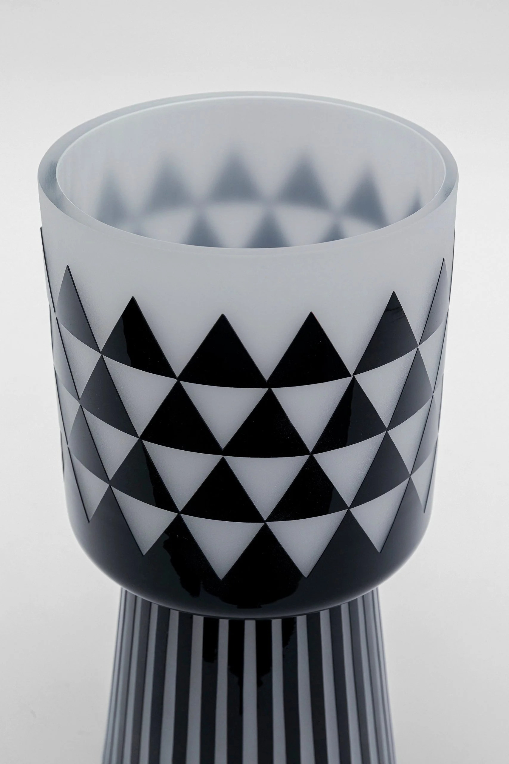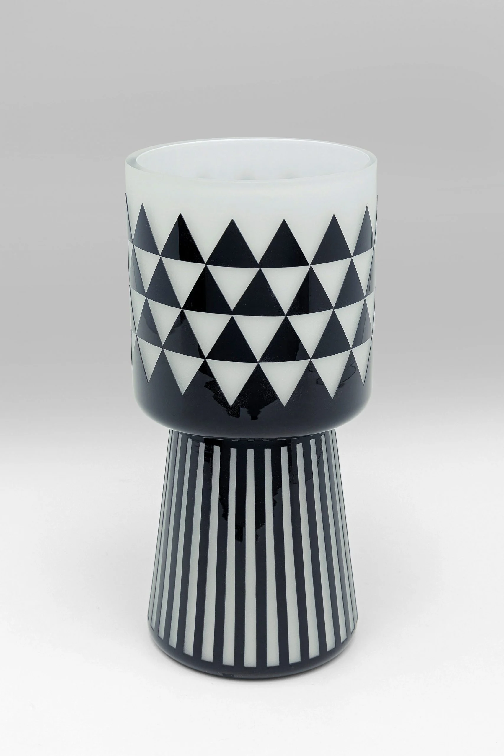Description: This vase is a decorative table vase, made of tinted glass and handcrafted. It features a unique, decorative pattern mix in black and white. This vase can be used to display flowers or as a standalone decorative piece.