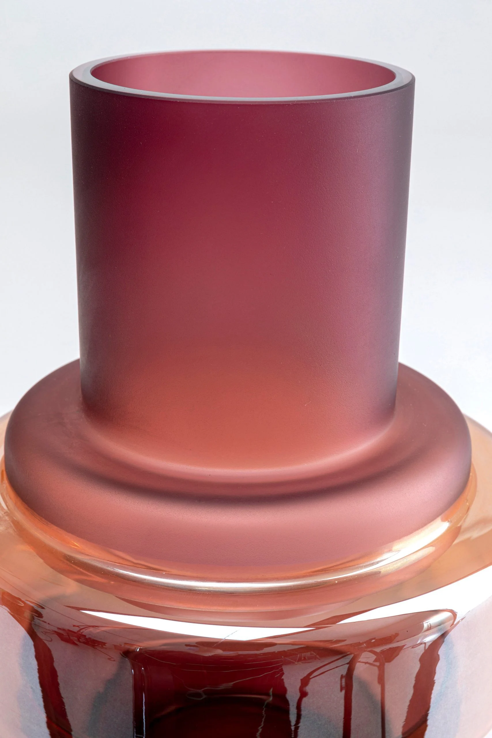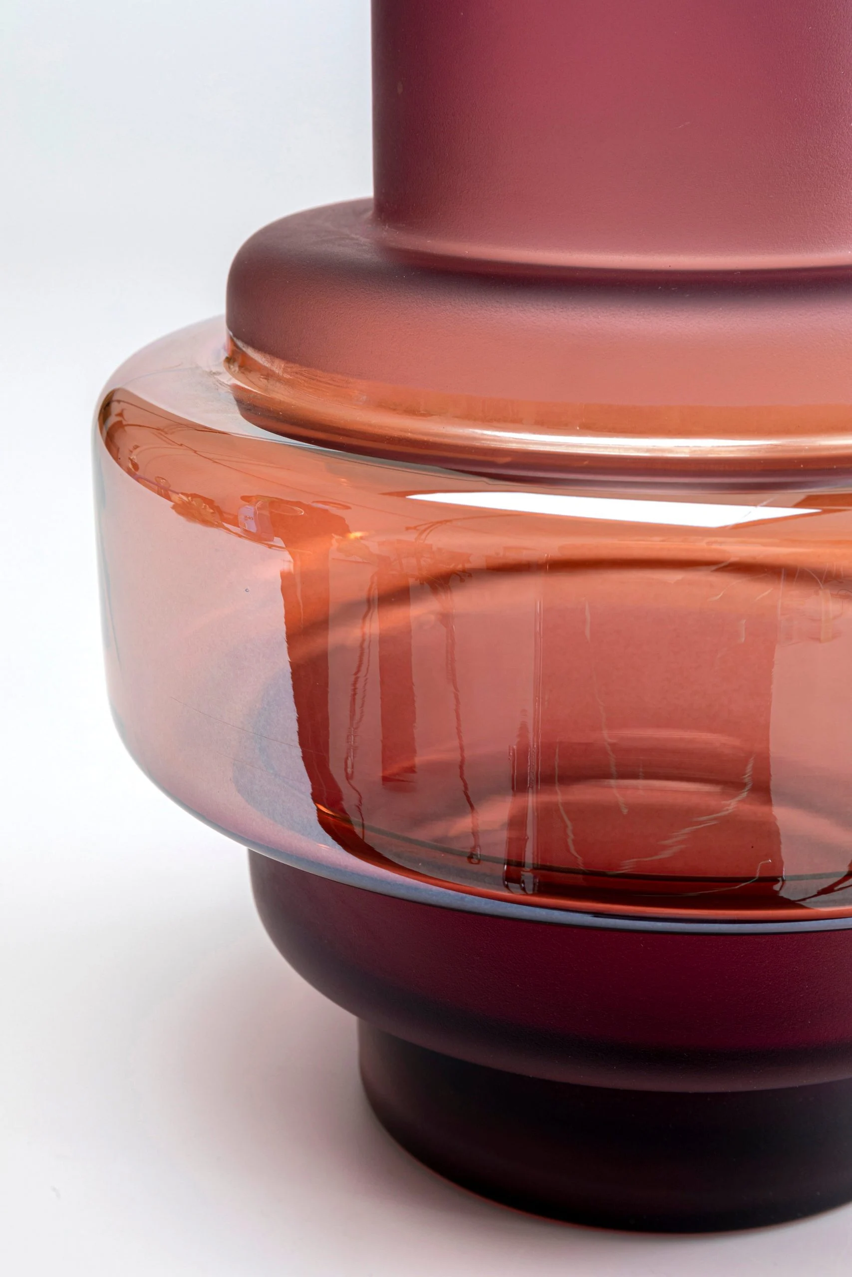 Description: This unusual glass flower vase looks like a modern work of art on the shelf or sideboard, even without flowers. The lilac-golden coloring with its transparent and matt areas looks particularly elegant when combined with brass accessories.
