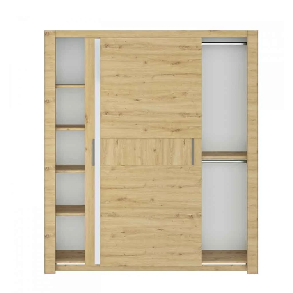 Wardrobe with 2 sliding doors 1/2 shelving (4 shelves), 1/2 hanging space (2 rails, 1 shelf), 1 mirror with clear silvered glass